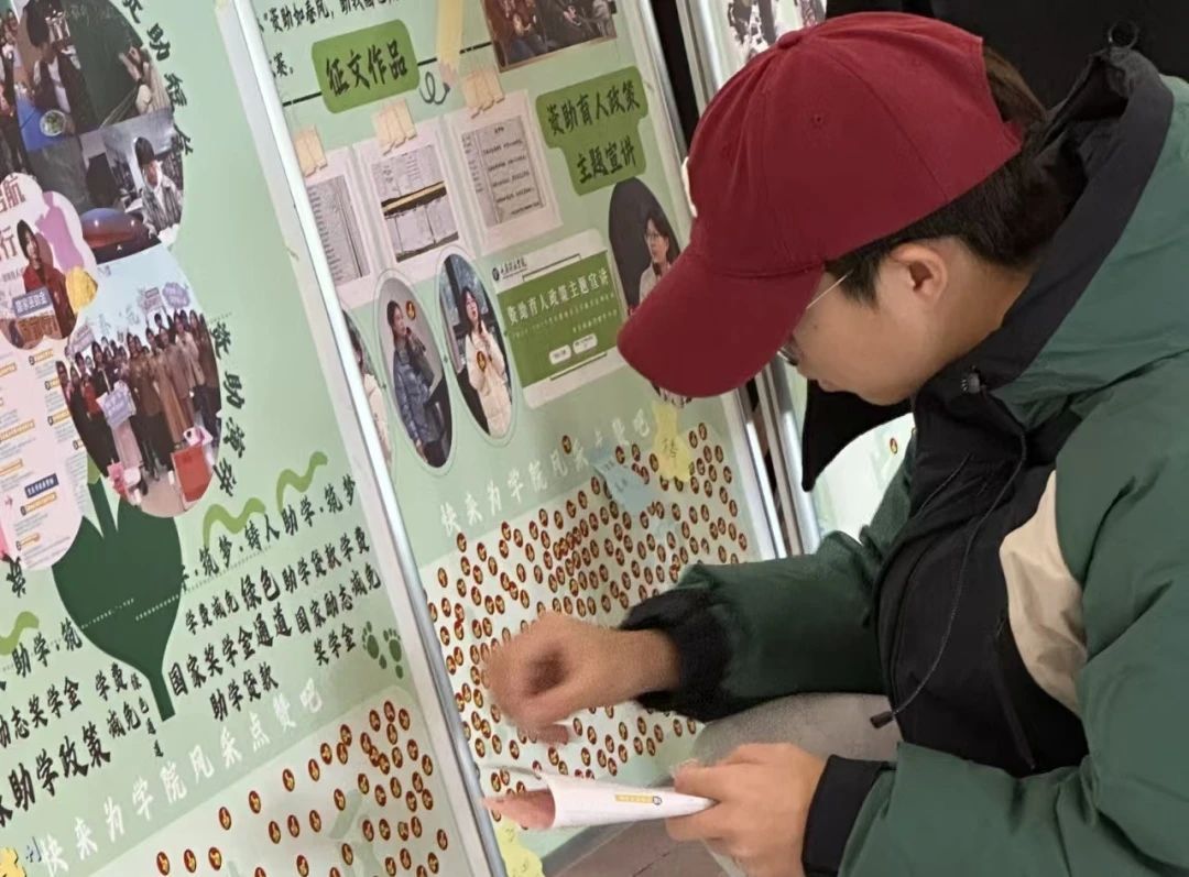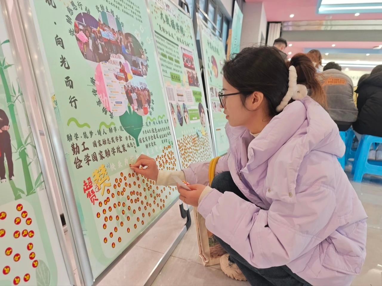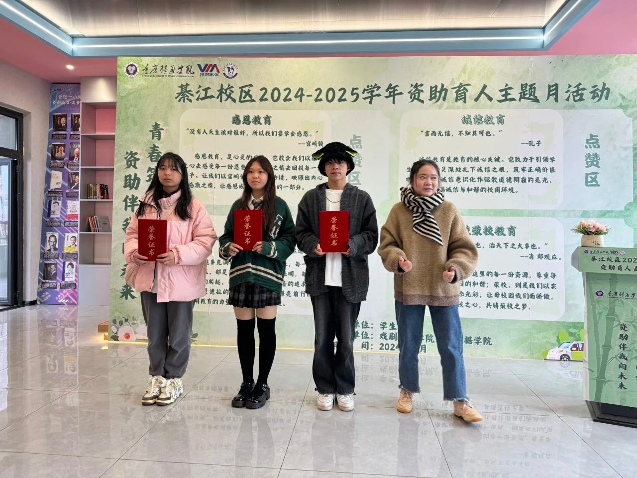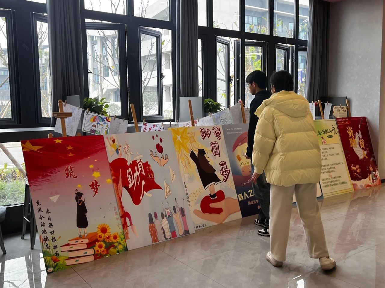 11月25日,由学生处牵头,戏剧影视学院和大数据学院承办的资助育人主题月活动成果展在丁山书院·金牛书吧盛大启幕。活动现场,戏剧影视学院将资助月的丰硕成果一一呈现,25幅色彩鲜艳、设计精美的资助海报抓人眼球,生动形象地展示出资助政策的要点与意义。旁边的展示架上,摆放着同学们创作的30多份文学作品,字里行间流淌着受助学子的心声与感悟,20多份手抄报则以图文并茂的形式,展现出资助育人的点滴故事。还有那些独具匠心的资助手工作品,凝聚着学生们的创意与感恩之情。150份资助宣传册整齐排列,有序发放,共计发放 80多份,大大提升了同学们对各级各类27项资助政策的知晓范围,扩大宣传,做到让资助政策人人知晓,为莘莘学子的成长之路点亮明灯。活动一经开始,便吸引了大量师生前来参观,仔细欣赏展示作品,并纷纷对各学院以及优秀学生、班集体展出育人成果点赞。此外,在资助感悟分享环节,戏剧影视学院于蓉蓉同学讲述了他在国家、学校资助政策下勇敢追光的故事。 在活动颁奖环节,共计 16 位同学在学院资助月活动中表现卓越,荣获嘉奖。此次成果展不仅是对资助月工作的一次完美总结,更是在校园内播撒下了资助育人的希望种子,为未来的资助工作奠定了坚实的群众基础,有力地推动着资助育人理念在校园内的广泛传播与深入践行,让更多学子在资助的阳光下茁壮成长,勇敢地追逐梦想。