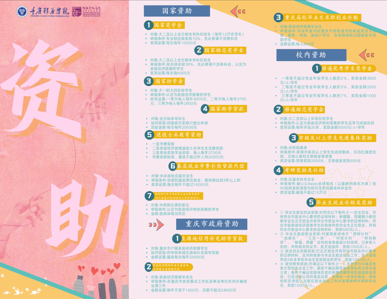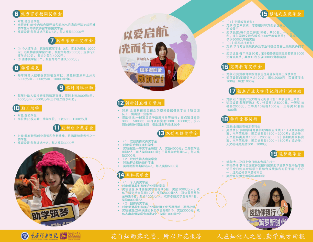 为了全面深入地推广资助政策,提升其知晓度和影响力,让更多学生受益于国家、省市及学校的资助体系。学院充分发挥自身专业优势,由勤工助学团队牵头,联合专业老师组成影视制作团队,全力投入到资助宣传短片和资助宣传册的创作中。团队紧紧围绕资助育人主题,精心策划拍摄内容,拍摄学生在资助政策下成长成才的生动故事,展现资助政策给学生带来的积极影响。制作完成后,宣传视频在学院官网、校级网络平台以及社交媒体平台等多渠道发布,广泛的传播途径确保了更多师生能够了解资助政策的积极意义。同时,勤工助学团队还精心制作了资助政策宣传册,详细涵盖国家、重庆市、学校各类资助政策29项,包括奖学金、助学金、助学贷款、勤工俭学等项目的申请条件、申请流程以及发放标准等关键信息,确保内容准确、全面,设计上力求精美、简洁、易懂,方便学生快速获取重要信息。