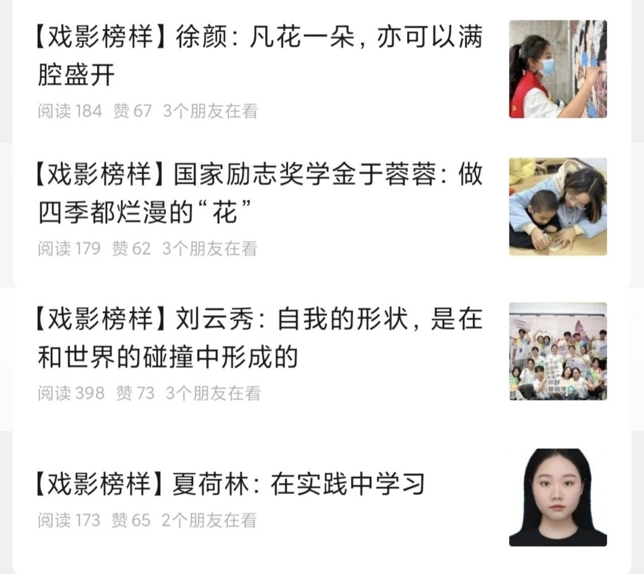 为了进一步宣传资助政策,展现资助育人成效,不断深化学校资助育人工作内涵,激励广大受助学生奋发自强、立志成才、感恩奉献,争做有理想、敢担当、能吃苦、肯奋斗的新时代好青年,营造良好的资助育人活动氛围。戏剧影视学院在11月开展了“以爱启航·向光而行”为主题的“六个一”资助育人专题行动,深入开展励志、感恩教育,树立优秀典型、发挥榜样作用。本月,共计开展6场资助主题活动,其中4场为校级活动,在院校两级平台发布相关稿件22篇,浏览量8000+,点赞量1000+,辐射人员1500余人。