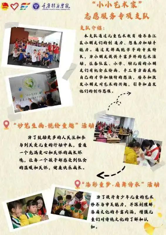 小小艺术家关爱儿童志愿服务专项支队,通过发挥我院学子的专业特长,培养綦江区小朋友们的创造力、想象力和动手能力,为小朋友提供丰富多样的艺术活动。让各社区、小学、幼儿园的小朋友们有机会在绘画、手工等方面展现自己的才华和独特的想法,培养和激发小朋友对艺术的兴趣,引导和启发他们的创作思维。