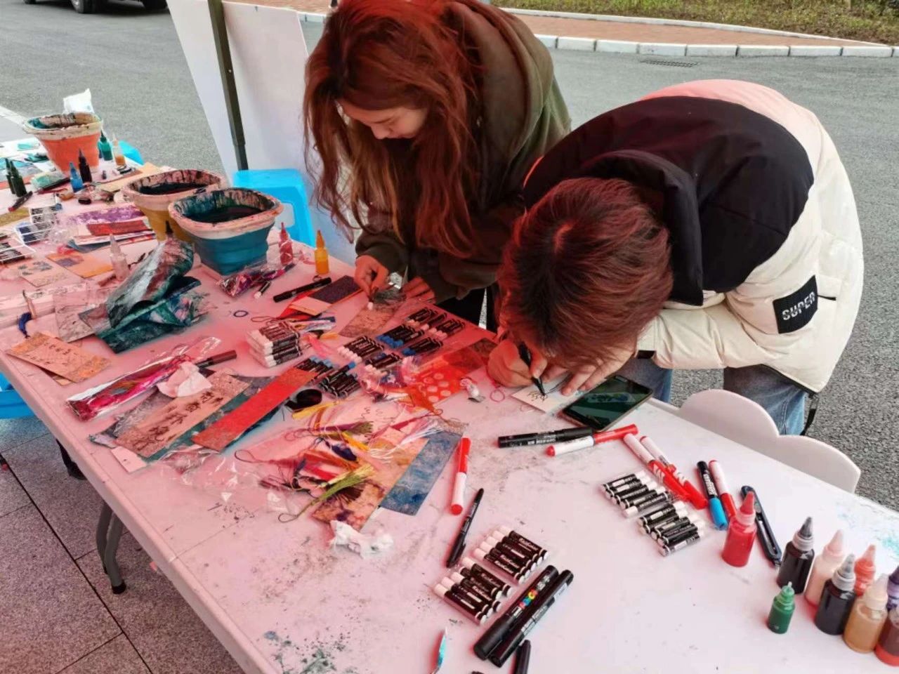益术家支队的志愿者们通过制作漆绘书签的方式,在宣扬中华优秀传统文化的同时,为学生的文化生活增添一抹亮丽的色彩。志愿者向参与者详细介绍了漆画的基本技巧和操作步骤,参与者们认真的挑选喜欢的颜色,轻轻地将漂漆滴入水面,体验不同色彩之间的碰撞与融合。参与者还在书签上写下有关保护环境的寄语,最终化作一件件精美的艺术品。