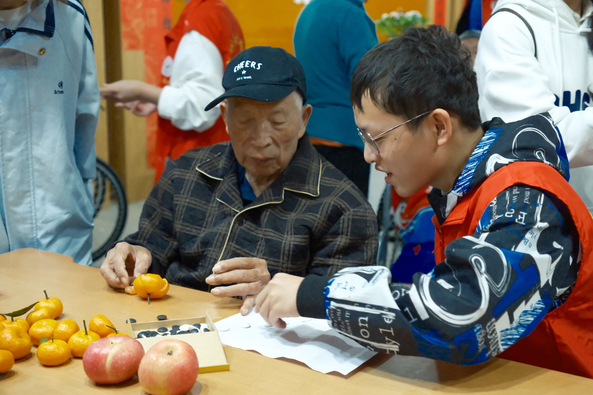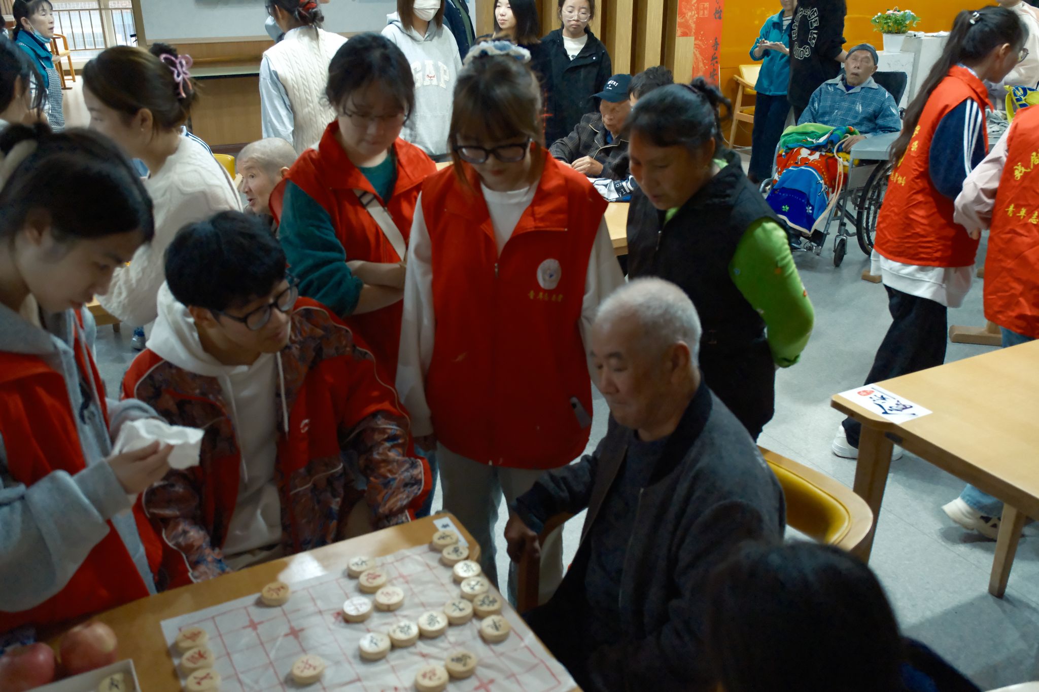 踏着淅沥小雨,同学们来到疗养院,为老人们带来丰富多彩的节目。志愿者陪老人下棋,双方围坐在棋盘两侧,一场场无声的“战斗”在楚河汉界间激烈展开。老人们眼神专注,落子沉稳,多年积累的棋艺功底尽显;志愿者们则虚心求教,在棋局中巧妙应对,时而陷入沉思,时而与老人相视一笑,现场气氛其乐融融。对弈过程中,大家不仅切磋棋艺,更在一来一往的交流互动中,拉近彼此的心灵距离。