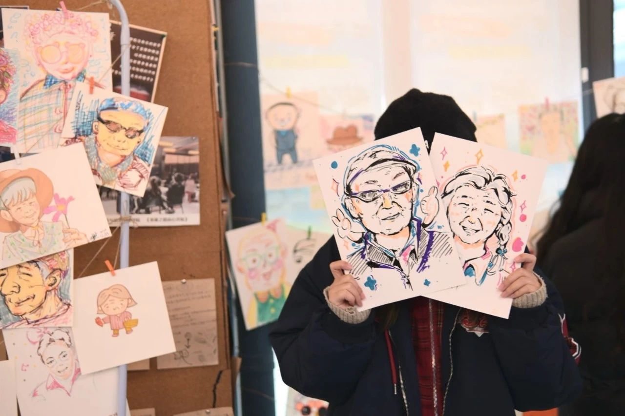 活动伊始,“小精灵”们汇聚一堂,他们手持充满魔力的画笔,以老人的岁月痕迹为鉴在时光画布上施展创意魔法。有的为老人画上了俏皮的粉红脸蛋;有的则用鲜艳的色彩描绘出老人和蔼的笑容。他们在画纸上勾勒、涂抹,色彩在他们的巧妙调配下欢快地跳跃、融合。渐渐地,一个个充满奇幻色彩和童真童趣的卡通头像诞生了!