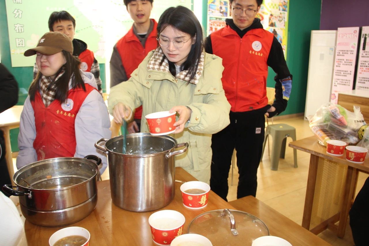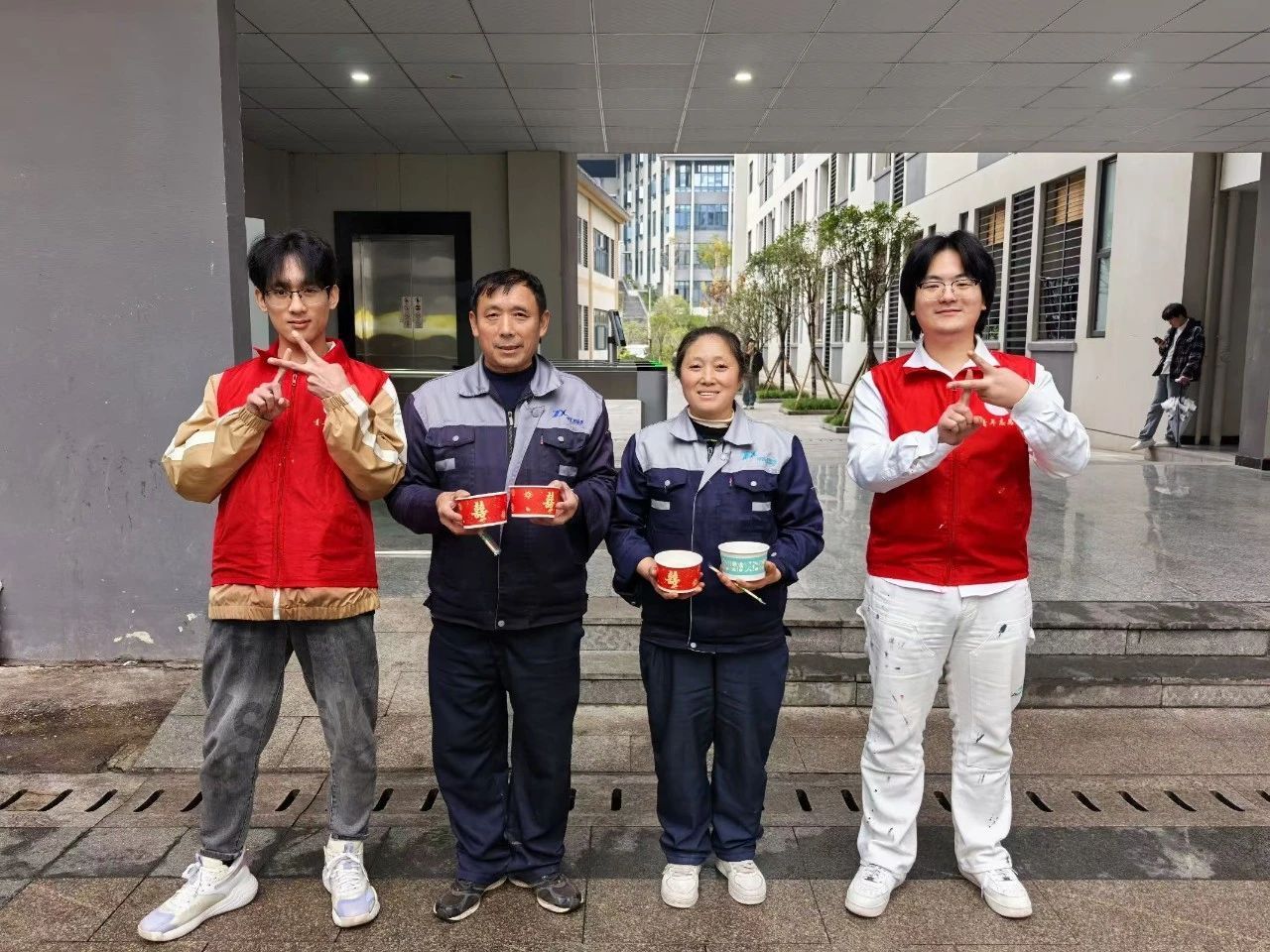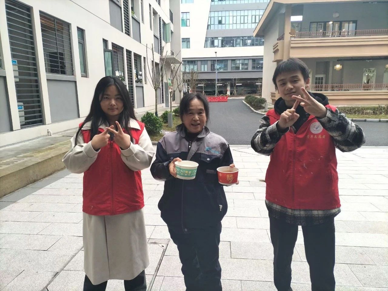 在完超活动筹备期间,辅导员邓艳老师强调,“在追求学习卓越的同时,也要重视活动中的全面发展和社会实践能力以及社会责任心的培养”。特此支部将完超团日活动与志愿服务相结合,开展“完超携手志愿行,青春力量暖人心”活动。班级成员分成小组,分别前往校园保安亭、书院值班处等地进行志愿服务,为他们送去热粥、热汤,传递冬日温暖与关爱。这一举措不仅体现了支部成员的社会责任感,也弘扬了志愿服务精神,激发了更多同学参与公益活动的热情。