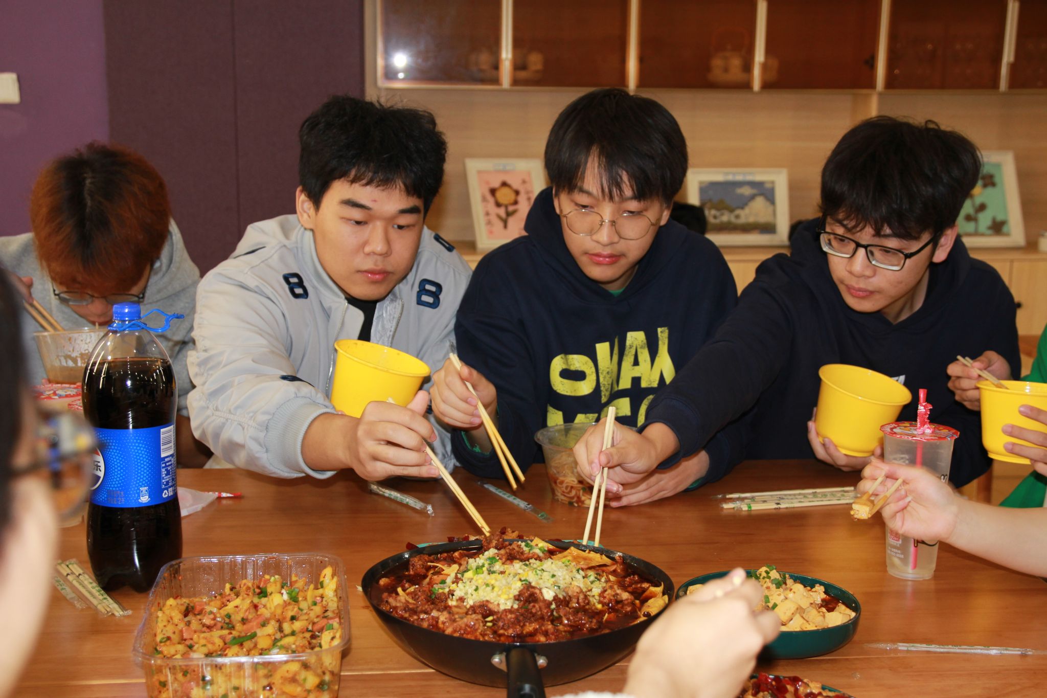 活动中期,“大厨们”登场,最先是小组一的同学们,分工明确,两人洗菜,两人对食材进行去腥,切片等工序处理。厨房里井然有序,充分体现了同学们团结一体、齐心协力的精神。起锅烧油,听见的是空气中辣子崩开的声音,闻到的是干辣椒与鸡肉翻炒的香味。伴随着洋芋花的出锅,才正在来到了辣、麻、爽的独特重庆风味。将目光转向小组二红彤彤的血旺与花椒辣椒起舞,在锅里迸溅,起锅时香菜小葱成了点睛之笔。而每一颗花椒,每一块香葱斗凝聚了同学们对家乡的思念。软软的豆腐吹弹可破,在同学们的手中展现出它独特的美味,豆瓣下锅,调出特有的重庆味道。最后由全班同学一起制作重庆人尽皆知的重庆小面,同学们排队调取自己的口味。精致的摆盘,热腾腾的云雾,整个厨房飘着佳肴气味也飘着各地同学对家乡的无限眷念。