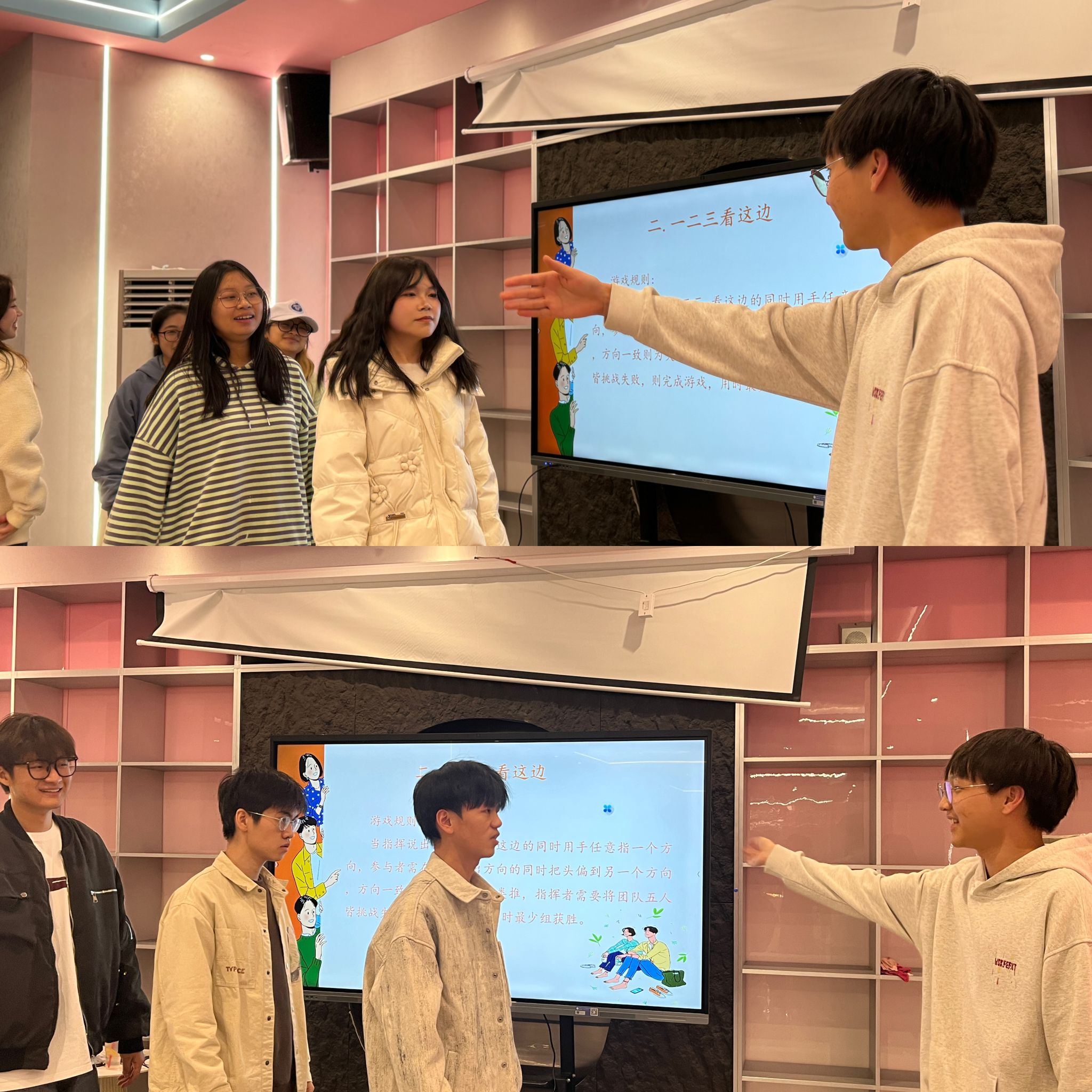 随后进行第二个游戏。此游戏在团体中进行,能够促进参与者之间的社交互动,增强团队合作精神。游戏简单易学,趣味性强,也能够为活动增添乐趣,使气氛更加活跃。同学们的目光随着指挥者的口令与手势转动。此游戏不仅能够锻炼同学们的反应速度和敏捷性,还可以作为一种轻松的社交活动,帮助同学们巩固社交关系,减轻压力和焦虑。此游戏需要多人参与,有助于增进同学们之间的交流和互动,增强社交技能。