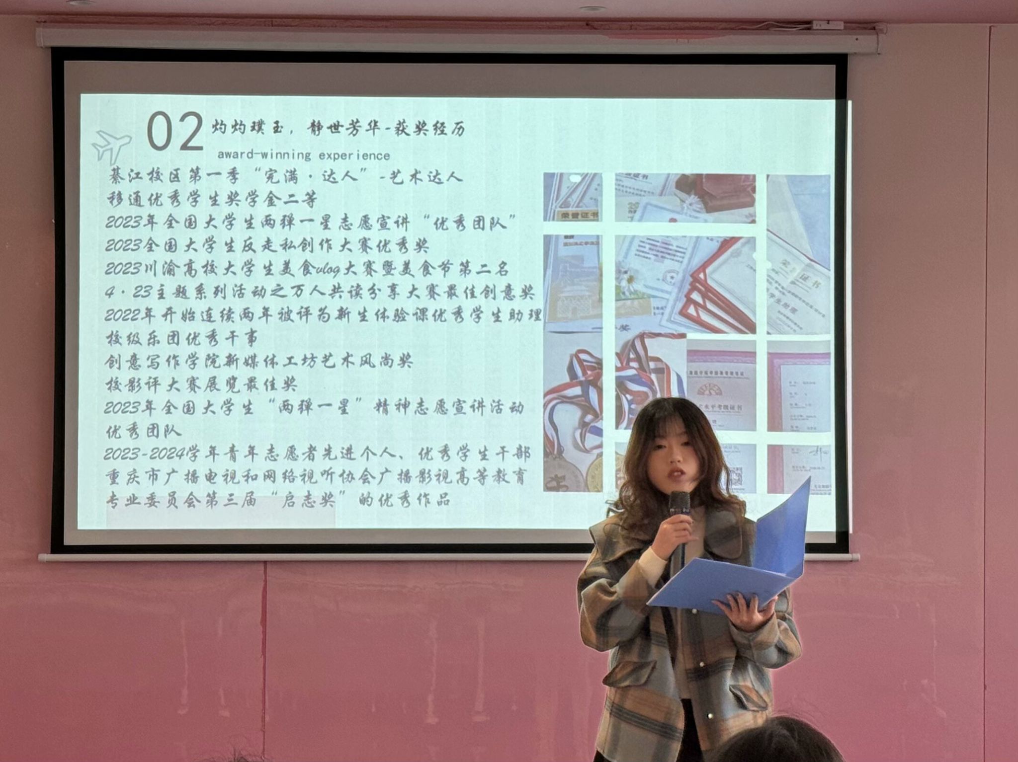 本期分享会有幸邀请到来自2022级戏剧影视文学专业的艺术达人——欧阳冰琰,来和大家分享。欧阳冰琰学姐从“款款独行,不致倾溢”“灼灼璞玉,静世芳华”“完满向前,抵达繁星”三个部分为大家分享了她的艺术完满生涯。