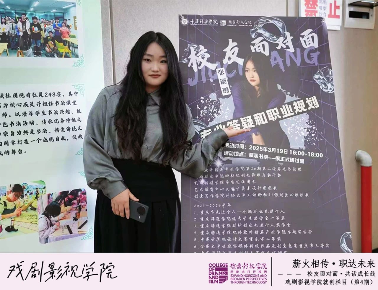 为帮助同学们尽早做好职业规划,了解更多职业选择,提高求职就业能力,戏剧影视学院于2025年3月19日下午在瀛溪书院——很正式研讨室特举办“‘校友面对面·共话成长线’就创栏目第4期之薪火相传·职达未来”活动,牵手优秀校友开展交流分享,充分发挥优秀校友的朋辈榜样作用。本次活动特别邀请到了重庆移通学院2021级动画专业的优秀校友张璐璐学姐作为嘉宾,与戏剧影视学院曾玉娇老师、林西康老师和50名戏娃,共同畅谈专业学习、实习目标的生涯规划。