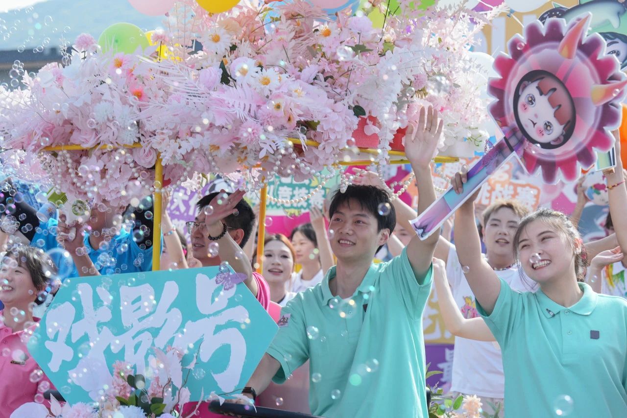 满载鲜花的车头带领着“多彩戏影号”缓缓驶来