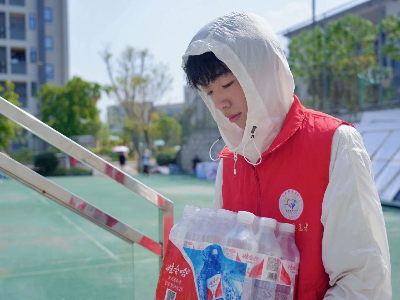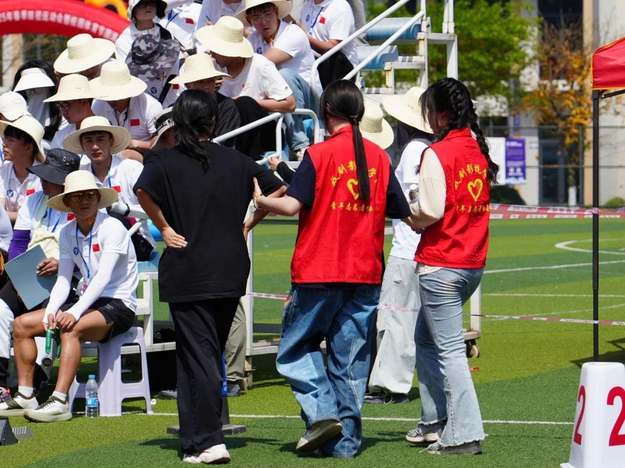 在田径运动员抵达终点之时,志愿者的身影尤为忙碌。他们迅速行动,第一时间递上饮用水,帮助运动员补充水分。面对因激烈运动而疲惫不堪的运动员,志愿者主动搀扶,引导其前往休息区并为他们提供遮阳伞、餐巾纸,为他们擦拭酣畅淋漓的汗水。在跳高、跳远、铅球等项目中,志愿者们展现出细致入微的服务。他们俯身轻拍运动员遗留在候场区的运动包灰尘,轻声引导运动员前往阴凉处的休息棚,途中还会贴心询问是否需要冰凉贴或补充电解质饮料。