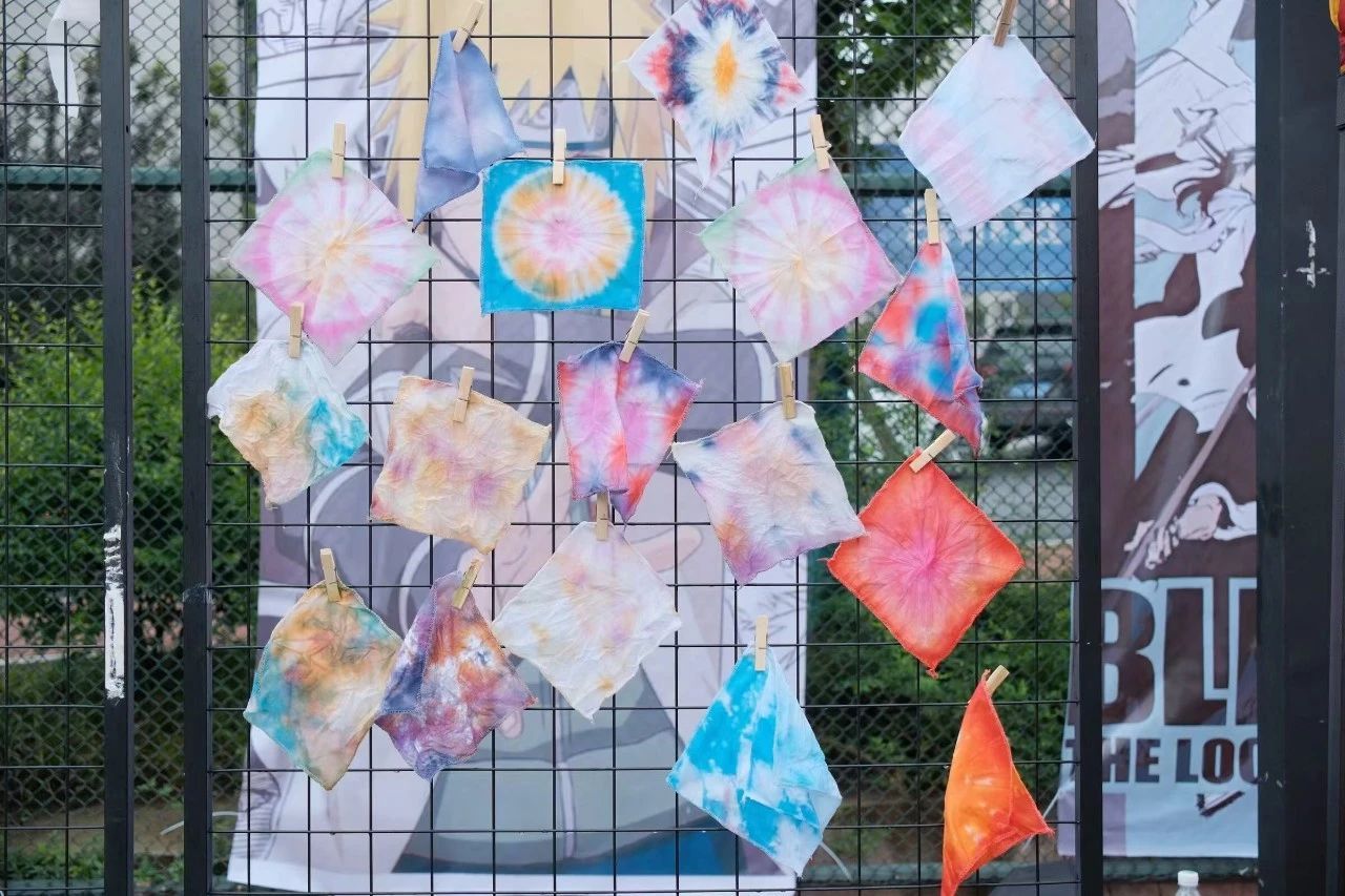 石膏娃娃涂鸦和扎染艺术工坊区域,充满了创意与欢乐。家长与孩子携手在石膏娃娃上精心绘制图案,将传统技法与二次元灵感结合,充分发挥自己的想象力和创造力,创作出别具特色的“二次元潮染方巾”。老师在现场悉心指导,鼓励大家大胆创新,分享创作灵感与经验。一个个独具个性的作品在大家的巧手下诞生,将本次活动文化融合生动呈现。
