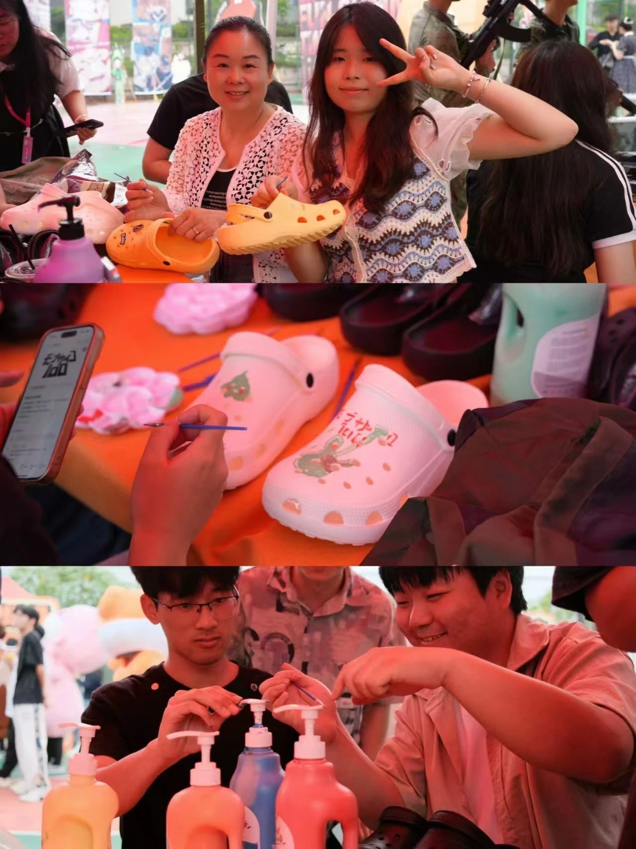 动漫涂鸦站的手绘洞洞鞋成为全场焦点,洞洞鞋成为年轻人彰显个性的新方式,席卷了整个社会风潮。参与者以丙烯颜料、马克笔和贴纸为工具进行DIY创作,将纯色洞洞鞋转化为承载个性宣言的艺术载体。从卡通形象到抽象涂鸦,每一双鞋都成为独一无二的创意符号,展现了年轻人对自我表达的极致追求。这一过程为现场的学生和家长们提供了创意空间和一次心灵解压的疗愈之旅。