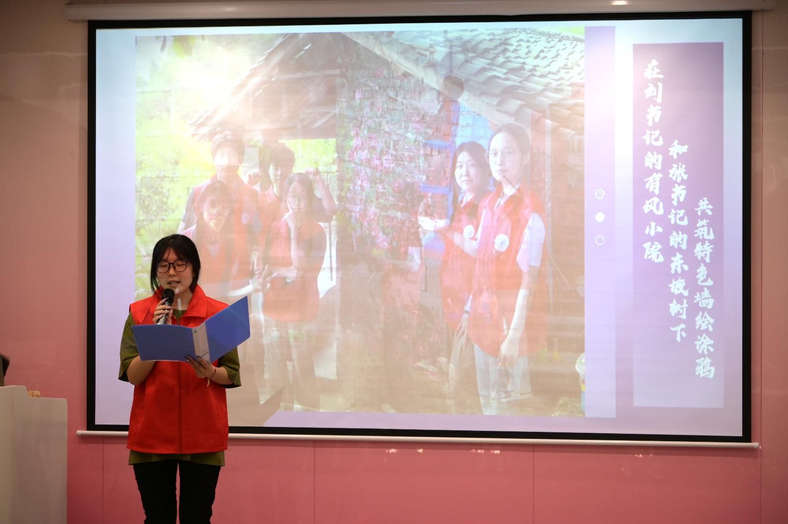 她分享到,在艺术课堂上,她化身为孩子们的艺术启蒙导师,用画笔与创意点亮孩子们心中的艺术之光。此外,她还积极投身旧物改造,将废弃物品变成一件件独具匠心的艺术品,让环保与创意完美融合。她讲述生动鲜活,让在场的每一位同学都深受触动与启发。张悦由衷地表示,“三下乡”这段充满美好与感动的珍贵时光,是人生旅程中一座熠熠生辉的灯塔,不仅照亮了当下的路,更将指引着未来在奉献与成长的道路上不断前行。