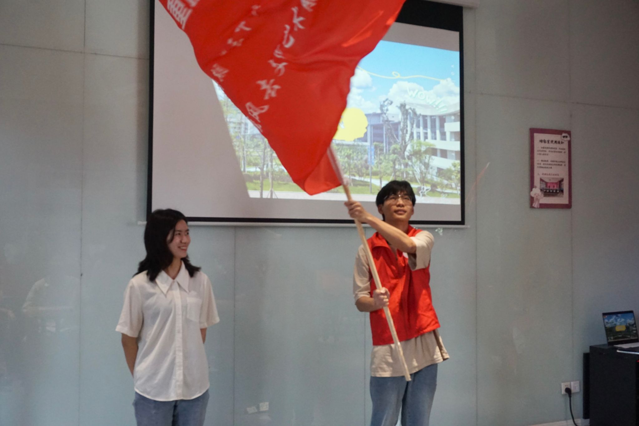 激昂热烈的授旗环节随即展开,李梦雪老师分别为两支队伍授旗。 当印着“瀛风去文化艺术服务团”、“移綦安理论普及宣讲团”醒目标识的旗帜传递到挥旗队员手中,不仅标志着戏剧影视学院三下乡志愿服务实践征程正式启航,更意味着2025年大学生暑期“三下乡”社会实践活动的大幕就此拉开。戏娃们将牢记使命担当,在基层实践中践行青年责任,书写青春答卷。