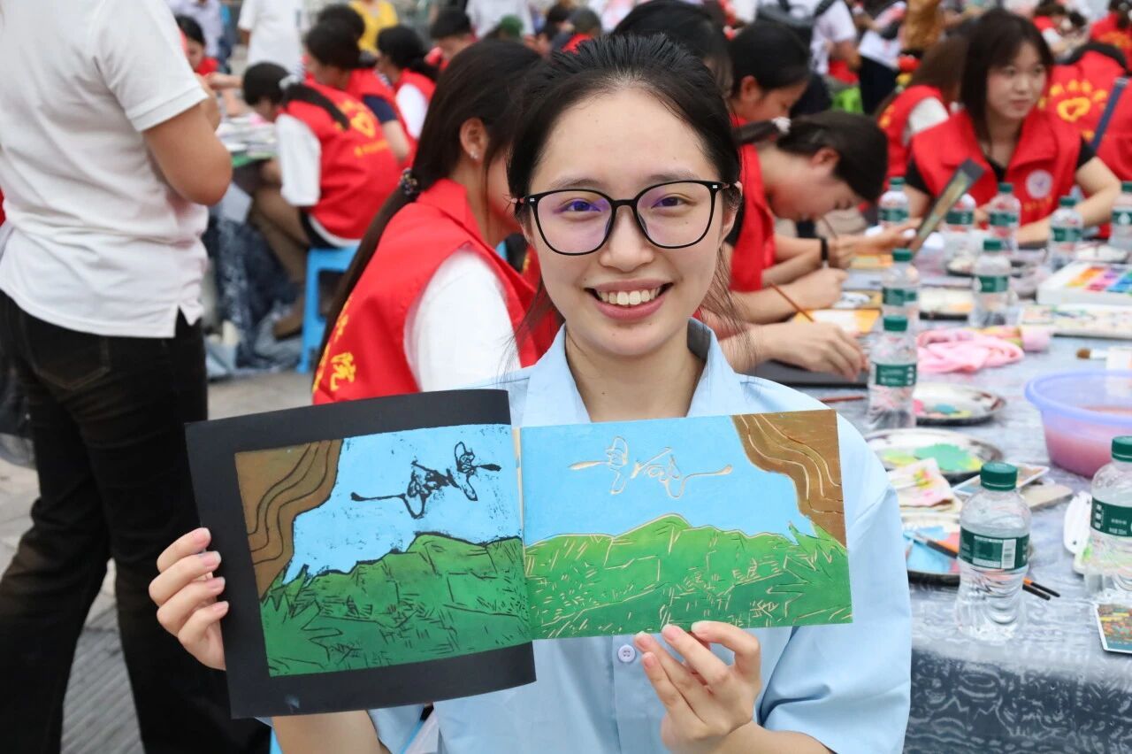 作为学生志愿者,这场千人版画活动,让我实现了从“文化学习者”到“传递者”、从“活动参与者”到“创作同行者”的成长蜕变。初涉活动,我在版画培训中沉浸式感受艺术魅力,看线条在版上勾勒成形,才懂版画的匠心。