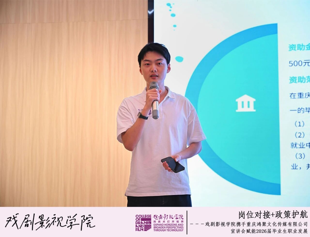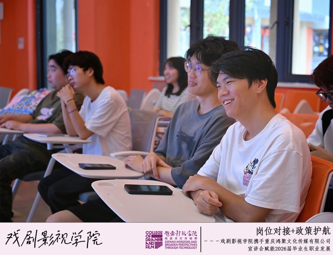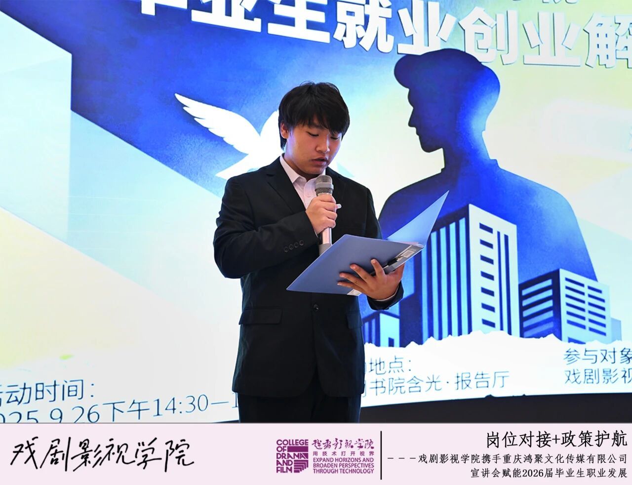 为切实解决2026届毕业生就业方向迷茫问题,9月26日戏剧影视学院联合重庆鸿聚文化传媒有限公司,在古剑书院含光·报告厅举办毕业生就业创业工作讲解暨企业招聘宣讲会,吸引各个学院毕业生到场参与。