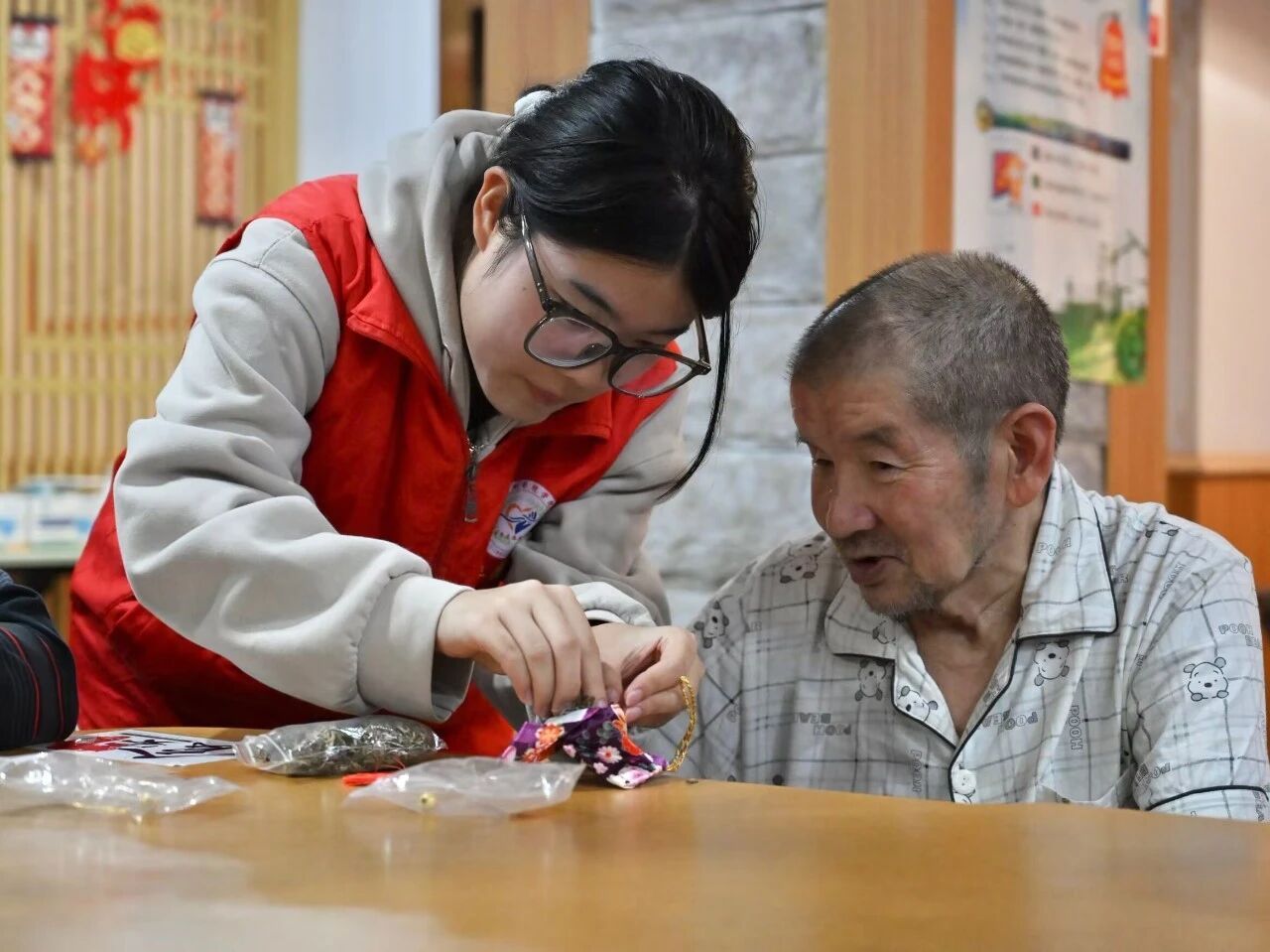 活动压轴的“DIY手工香囊制作”环节温情满满。志愿者们耐心讲解制作步骤,手把手协助老人操作。老人们在志愿者的陪伴与引导下,一针一线缝制出精致的香囊,现场其乐融融。制作完成后,志愿者仔细检查每个香囊的牢固度,将成品递到老人手中,送上节日的祝福与问候。