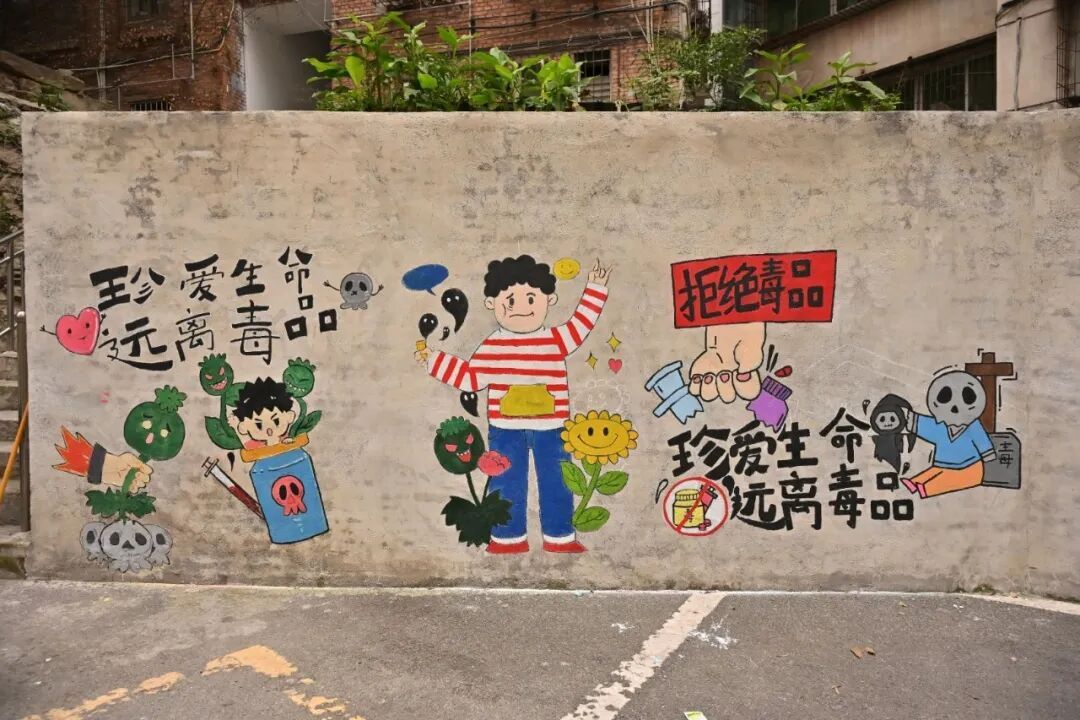 随着时间推进,原本单调的墙面,在志愿者们的精心绘制下,渐渐被丰富的色彩与生动的禁毒主题图案覆盖,增添了不少生气。图案内容围绕“健康人生、绿色无毒”展开,有直观的毒品危害警示画面、防毒禁毒科普插画,还有“珍爱生命,远离毒品”等清晰醒目的宣传标语,每一笔色彩都凝聚着志愿者们普及禁毒知识、守护社区安宁的真诚用心,让禁毒理念通过视觉形式更加深入人心。