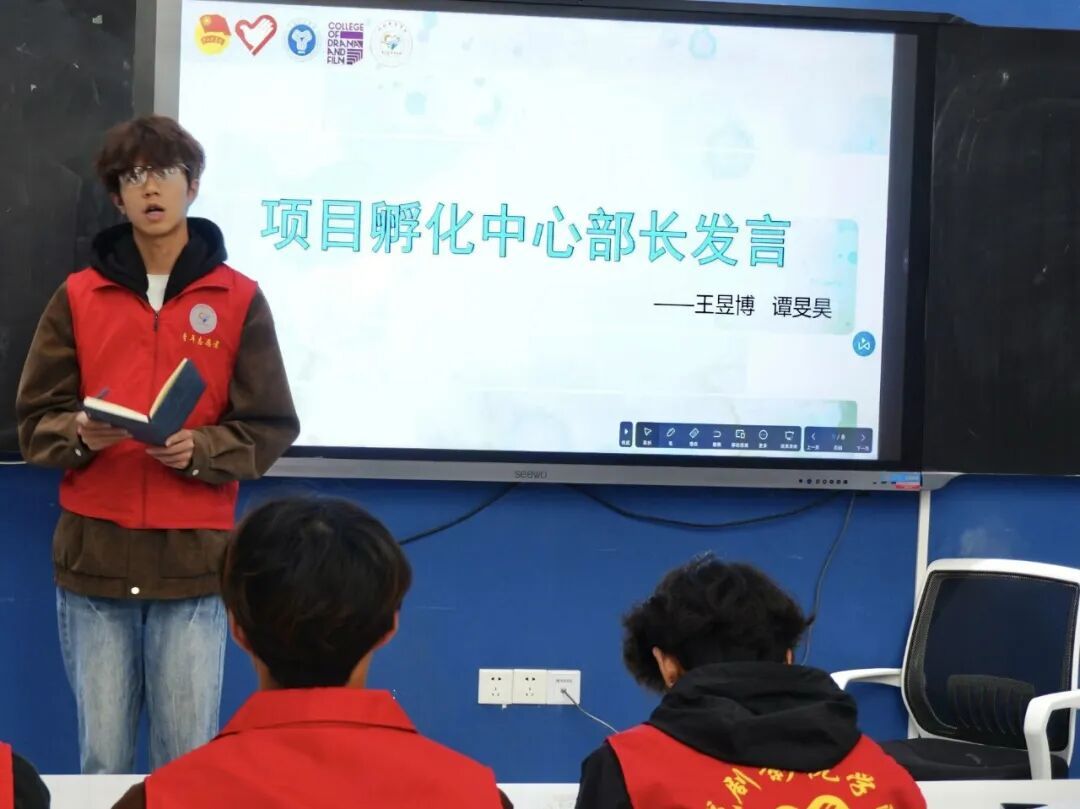 项目孵化中心负责人谭旻昊从活动项目与服务阵地两个维度展开汇报。他分享了活动阵地建设经验,并通过具体案例展示了各部门在材料提交、宣传配合等工作中的紧密协作。这些有效合作为志愿活动的顺利开展提供了坚实保障,充分体现了青协团队的协作精神。