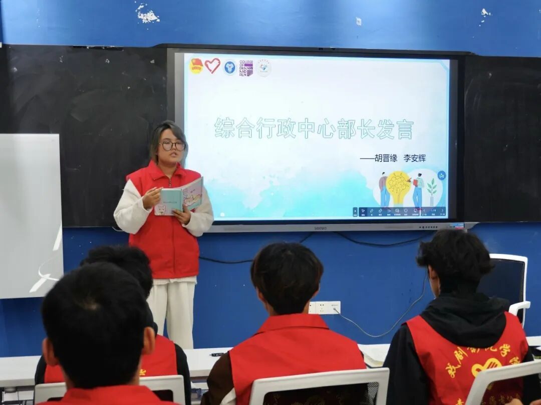 会议伊始,各部门负责人紧扣“复盘总结+未来规划”的核心思路,依次登台汇报工作。活动实践中心部长韩扬首先发言,系统回顾了新学期各项志愿活动的开展情况。他强调,新入职的干事应尽快熟悉工作内容,主动承担责任,以严谨认真的态度推动志愿活动有序开展,确保服务落到实处、取得实效。