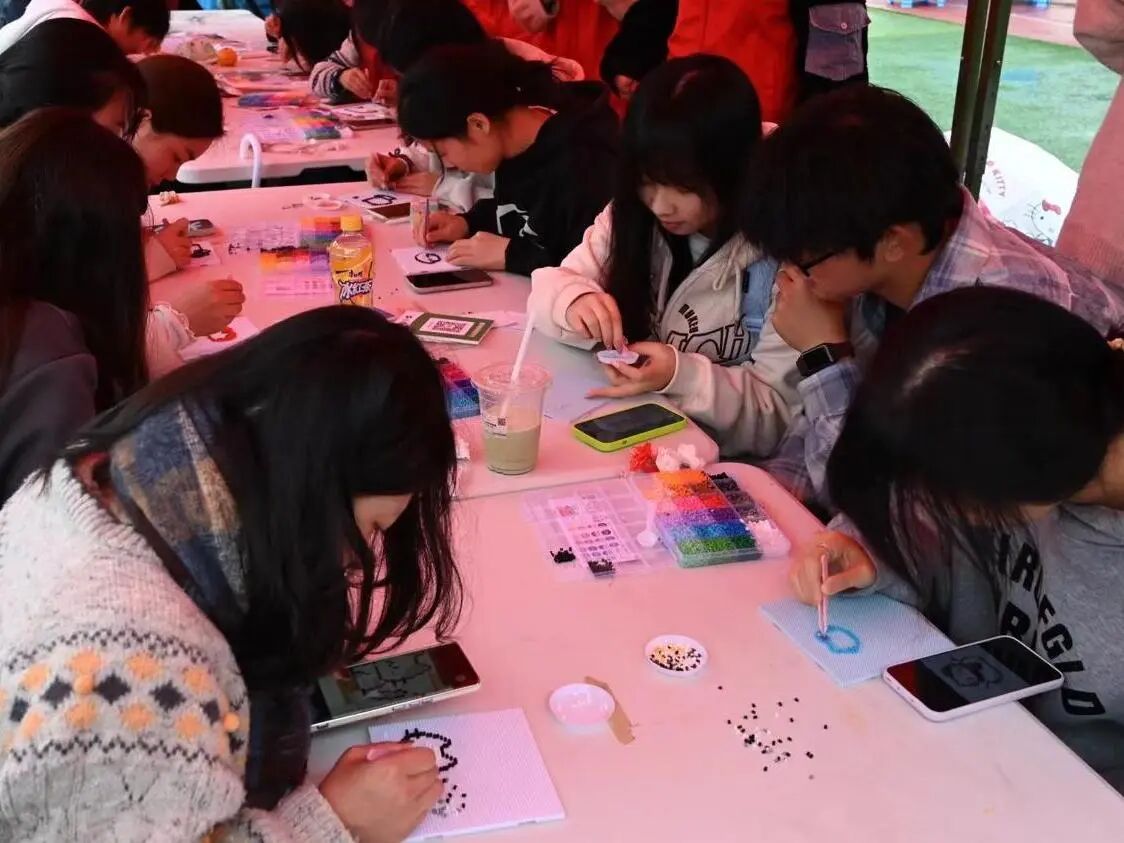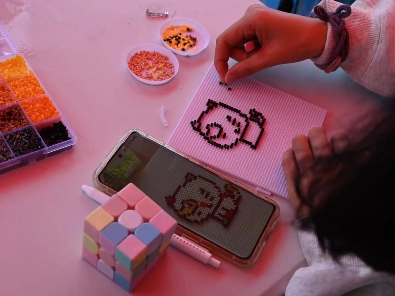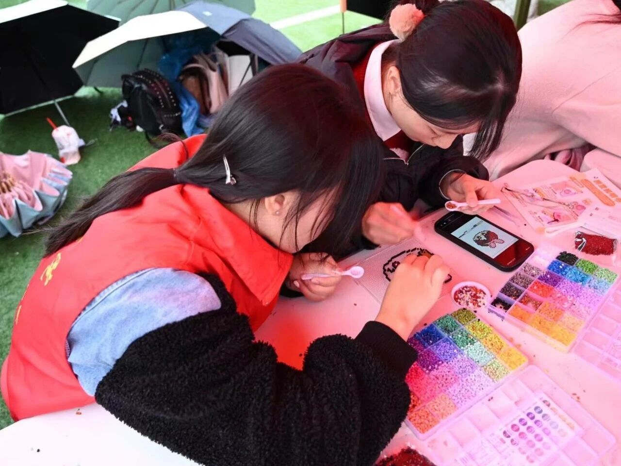 活动现场备有色彩丰富的拼豆材料与齐全的工具,志愿者全程提供耐心协助。参与者既可挑选心仪图案,由志愿者协助完成制作,也能亲自动手,沉浸式感受拼豆创作的独特乐趣。指尖翻飞间,一颗颗小巧的拼豆逐渐拼凑成各式可爱造型,既有简约的几何图案,也有生动的卡通形象,每一件作品都凝聚着创作者的巧思与心意。