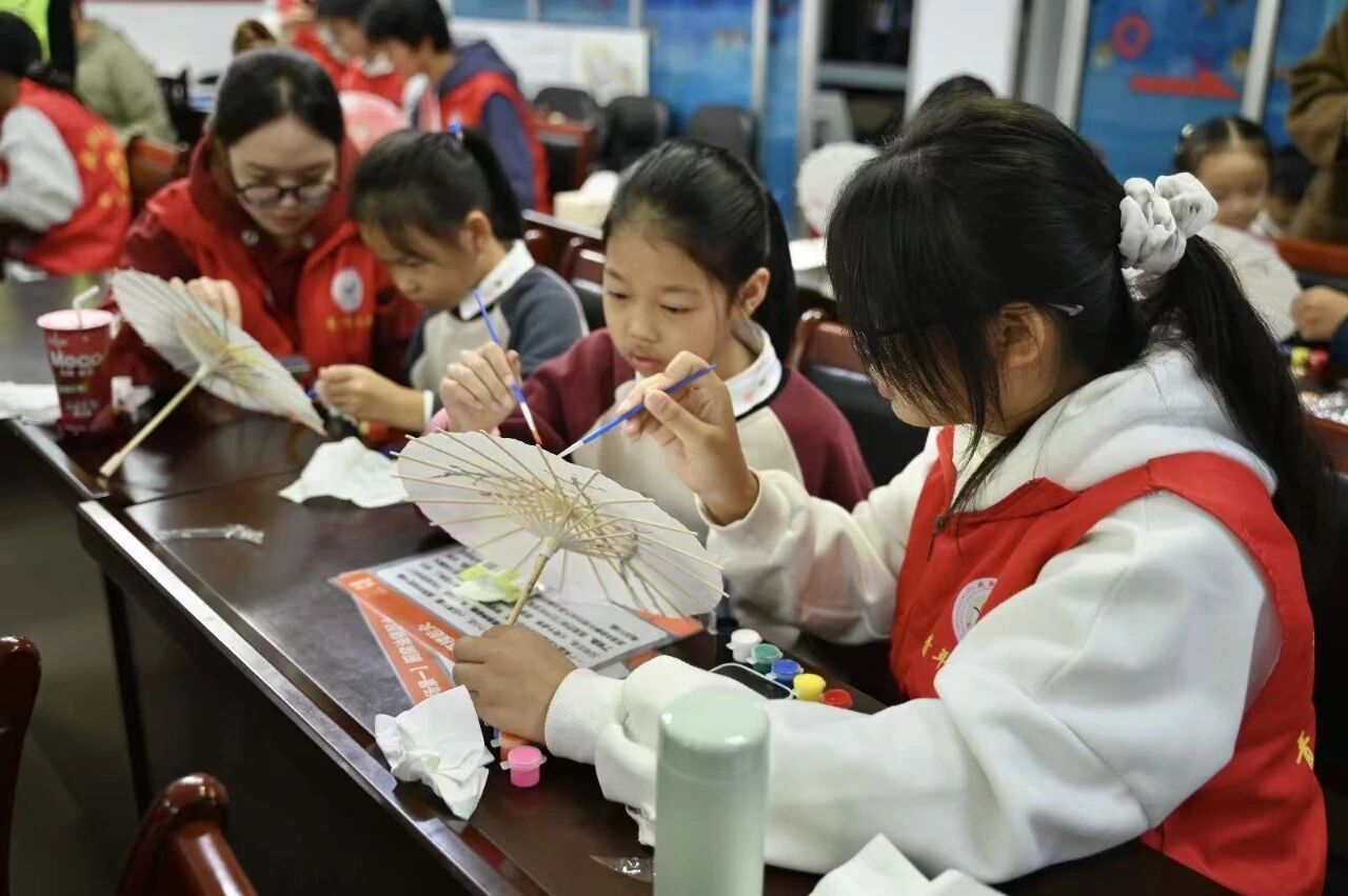 动手实践环节,孩子们在志愿者的专业指导下,亲身参与油纸伞绘画创作。他们手握画笔在洁白伞面勾勒心中的红色图景,将革命精神与艺术创意深度融合,在锻炼动手能力的同时,于潜移默化中深化了对家乡红色历史的认知与理解。