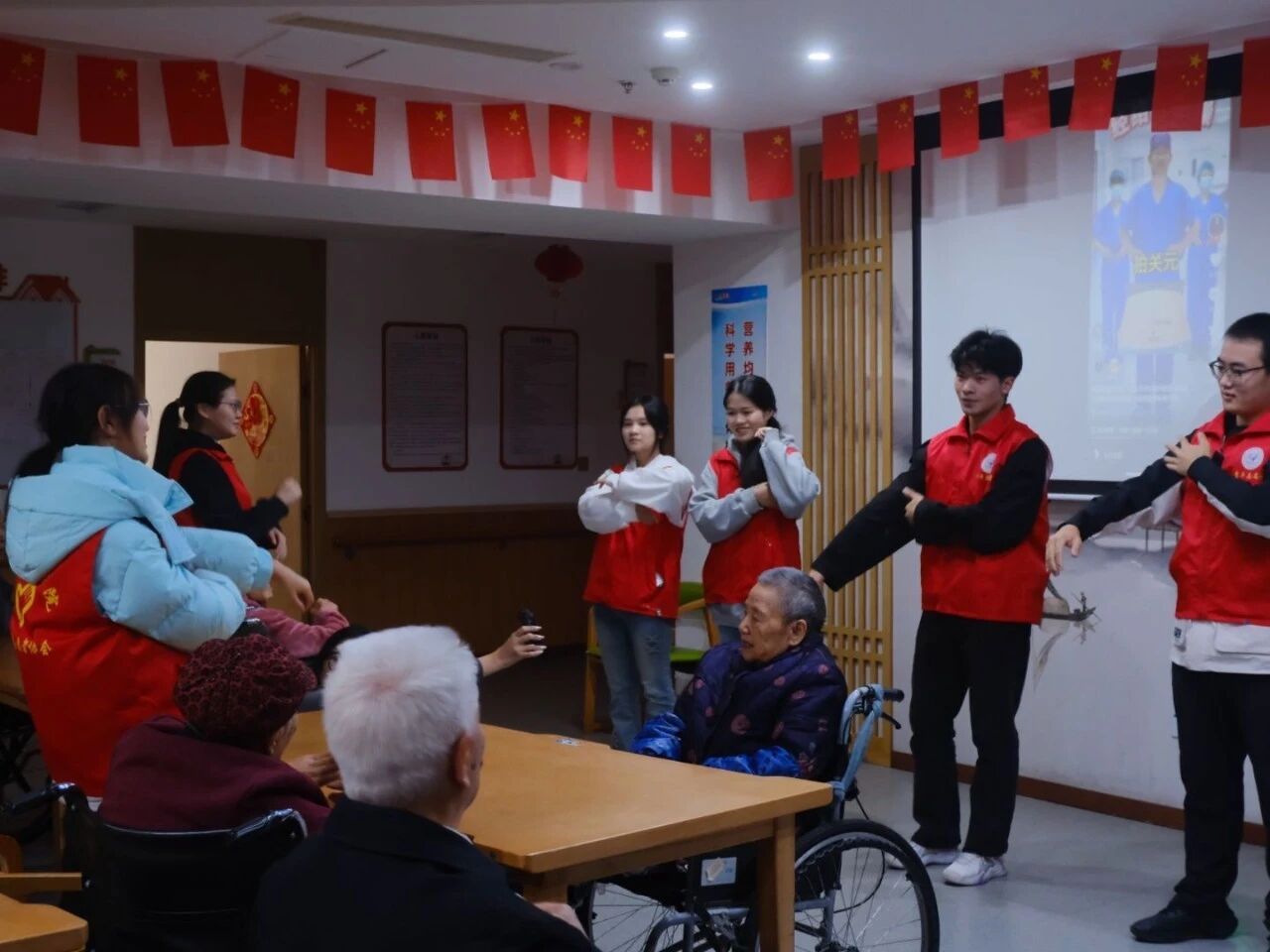 活动在轻松愉快的“健康拍手操”中拉开序幕。志愿者精选适配老人的轻快音乐,现场示范扩胸、转腰、拍手等动作。对能起身的老人热情鼓励参与,对行动不便的长者则引导其在座位上活动手部与肩部,全程关注老人状态,以舒缓节奏与融洽气氛帮老人们舒展身体、放松心情。随后的“经典怀旧歌舞”环节,志愿者演唱《东方红》等经典老歌并邀请老人共同跟唱。熟悉旋律唤醒往昔记忆,不少老人眼中泛起泪光、脸上洋溢温暖笑容,志愿者用掌声与赞美回应每一份勇敢的歌声——音乐化作连接两代人的情感纽带,让现场满是温馨与感动。