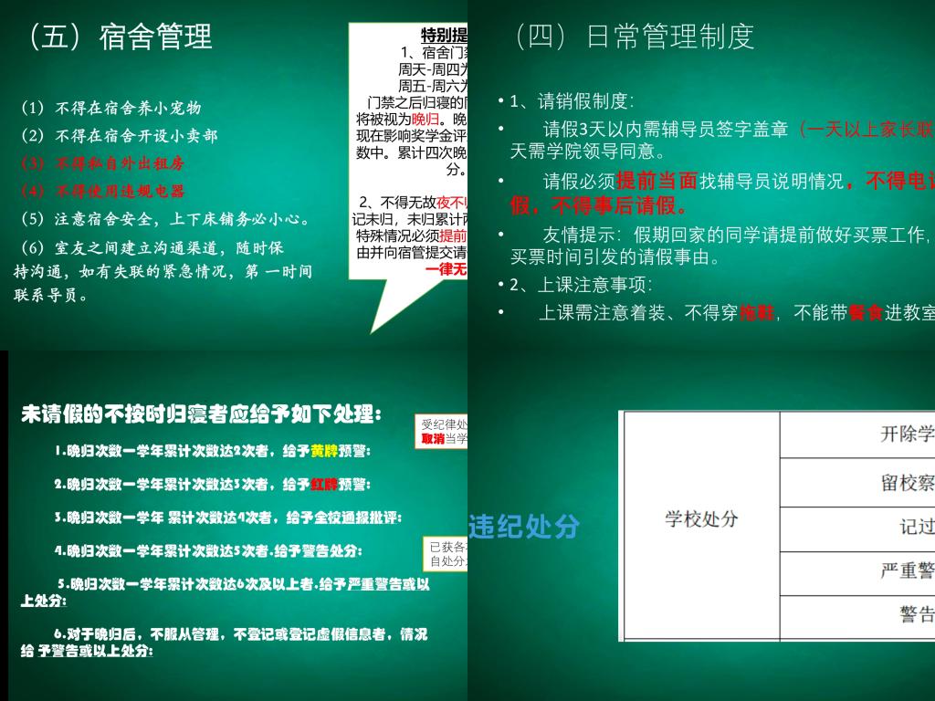 没有规矩,不成方圆。辅导员张焕忠老师为同学们解读学校日常管理制度、宿舍管理制度、以及学校的违规处分条例。同学们进一步明确大学生的权利和义务,规范自己的行为,使每位同学都能全面掌握学生管理的具体内容,提高学生的思想认识,自觉遵守各项校纪校规,提高自我教育、自我管理、自我服务和自我约束的能力,达到“切问近思,自能发展”的目的。