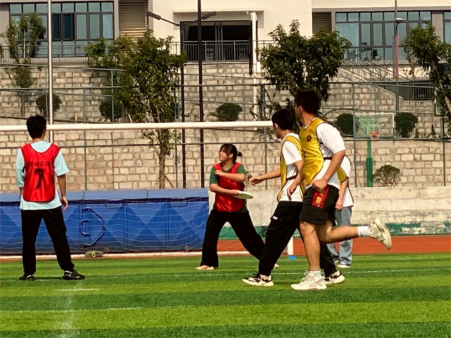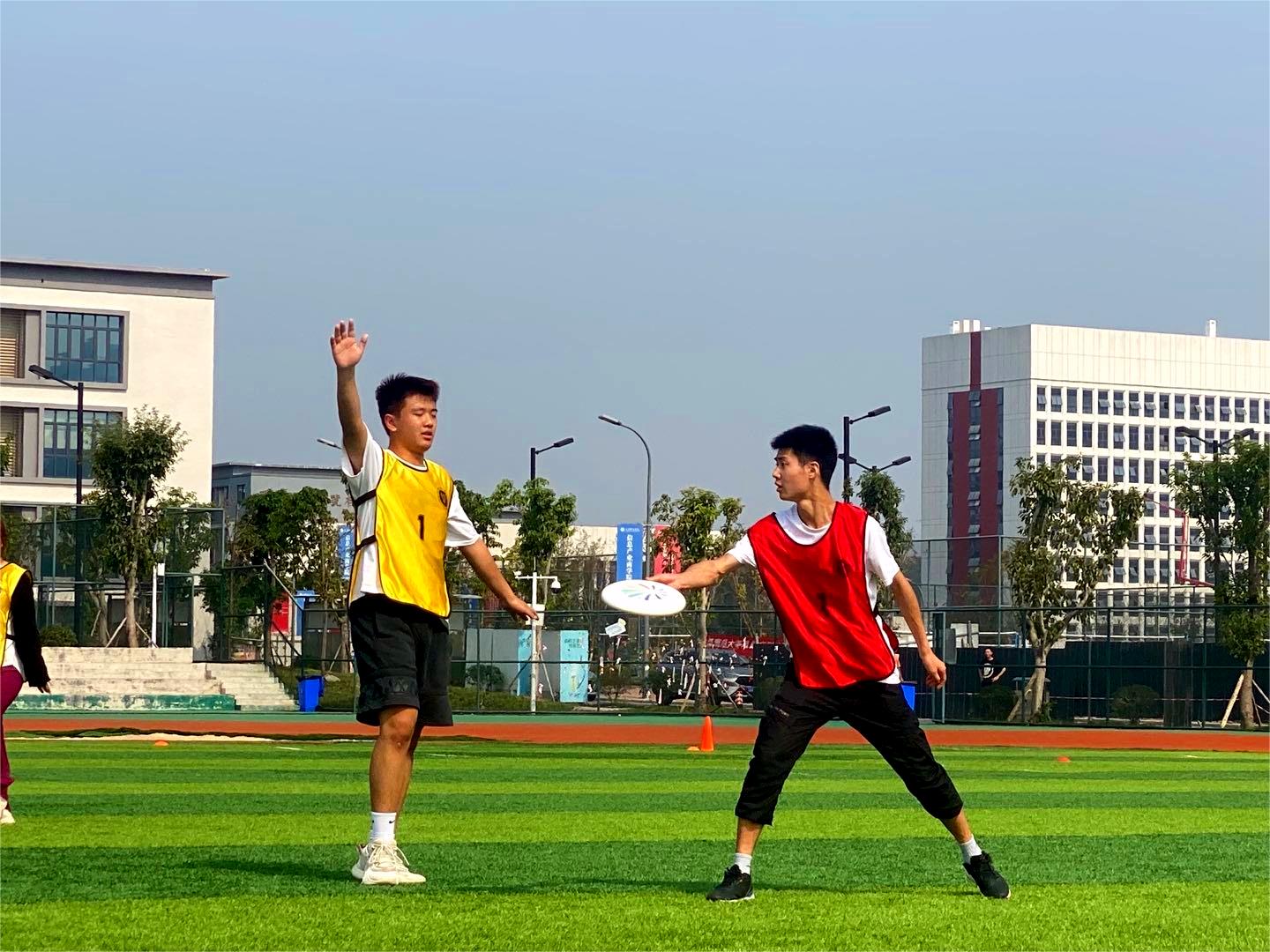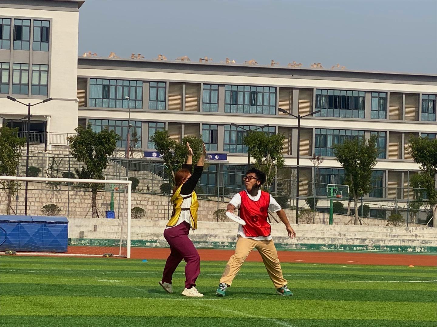 11月,玉竭凝霜,百花摇落,色损香消,惟有菊花含苞吐蕊,菲然独秀,用瑰丽迷人的色彩,酿出一行行诗语,凝成霜的精魂,露的花魂,在风中翩翩起舞。在这个诗意的季节里校园把自己的绚丽、缤纷、洒脱展示得淋漓尽致。冬季即将到来,为了增强我院学生身体素质,进一步推动我院体育活动发展,提高大学生课余生活质量,展现出新时代大学生的精神面貌和凝聚力。在此时节,由我院辅导员老师张焕忠、体育协会干部带领大健康管理学院运动健儿登上“飞盘赛”赛场。他们齐心协力、无所畏惧,彰显健管学子的风采。