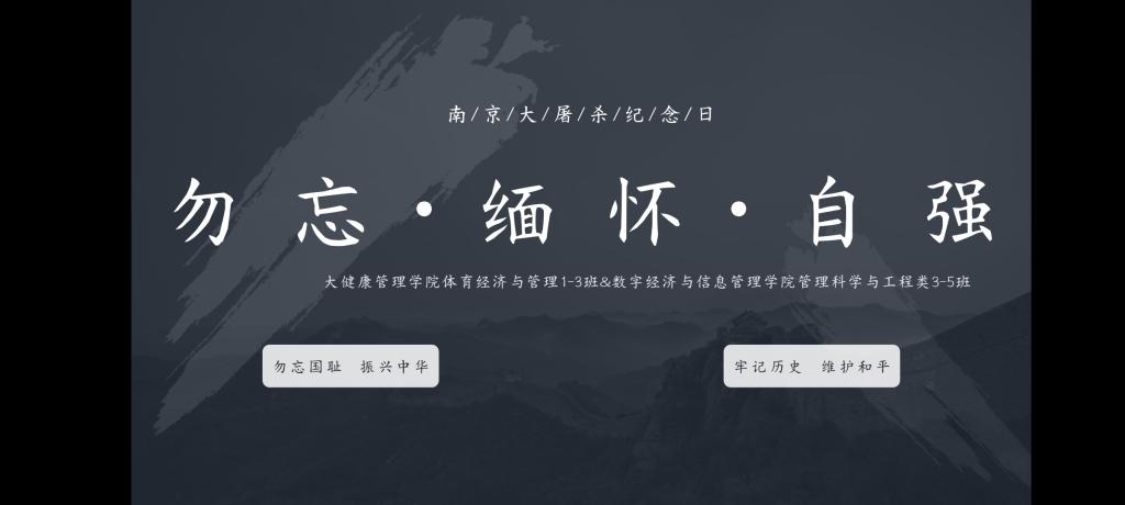 1937年12月,山河肃穆,草木含悲。一段悲怆的岁月,“30万”这个永难磨灭的数字,中华门城墙上留下的弹孔依旧清晰可见。为了真切地了解历史,正确地认识历史。激励学生的爱国热情,引导同学们树立正确的价值观,大健康管理学院体育经济与管理1-3班&数字经济与信息管理学院管理科学与工程类3-5班于2022年12月13日通过线上腾讯会议举办了“勿忘·缅怀·自强” 国家公祭日主题思政活动。