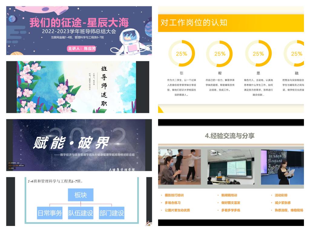 一百天的工作时光,各位班导师在数字经济与信息管理学院和大健康管理学院留下自己的足迹。通过各位班导师丰富多彩的ppt和绘声绘色的讲解,好像把我们带回活动现场,让我们身临其境的感受班导师和新生之间的点滴。