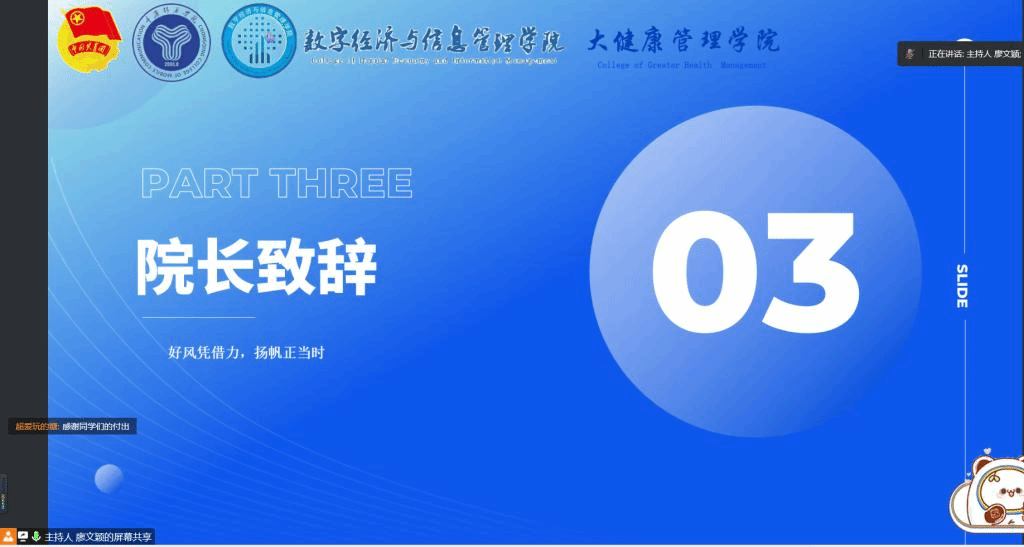 班导师的工作进入收尾,在班导师述职完毕后,任院长首先对12位班导师表示感谢和肯定,对因为身体抱恙而无法述职的三位班导师表示关心,也贴心关怀各位同学的身体状况。然后任院长谈到,因为特殊的缘分,数字经济与信息管理学院第一年开启双校区模式,大健康管理学院则是从0到1,非常感谢来自淬炼·国际商学院12位班导师的鼎力相助,才能使数信和健管两院的基础工作顺利开展。同时,任院长也期望数信和健管两院学子能够迅速成长,在校园生活中历练,汲取完满实践的养分,在下学期成为能够支撑起数信和健管完满活动和基层工作的骨干。