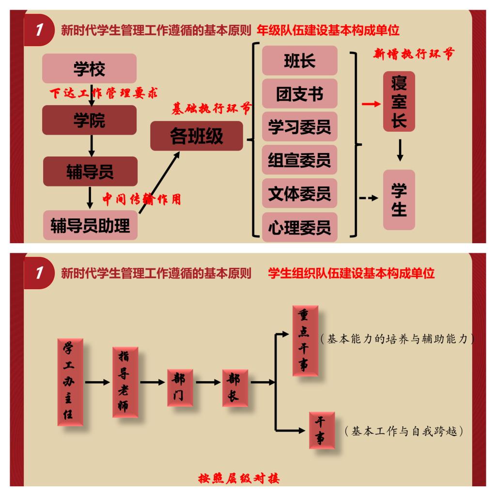 悬衡而知平,没规而知圆。面对新时代学生管理工作遵循的基本原则,班导师尹云晖从年级组织队伍建设和学生组织队伍建设学院层面出发,为大家分析了年级组织上每个班委的工作职责和学生组织上每个部门的工作职能,帮助青年团干部更加明确自己的定位,强化青年团干部的责任意识,遵守日常工作基本原则。也更加有利于日后年级组织队伍和学生组织队伍之间的配合工作。