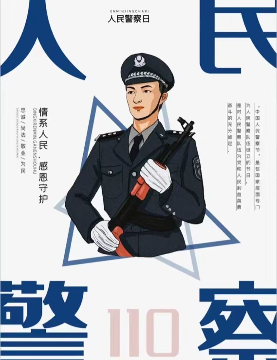 往日都是您们保护守护着我们,今天在属于你们的这个特殊节日里,换我们来向您们祝福,愿您们能永远开心快乐。绝对忠诚党和人民事业的人民警察队伍,您们始终勇于担当作为,甘于牺牲奉献,用辛勤的汗水乃至宝贵的鲜血和生命,为国家安全、社会公共安全和人民生命财产安全筑起了一道坚不可摧的铜墙铁壁,换来了广大人民群众的安宁和幸福。您们就是人民群众最大的“安全感”,是国家最坚不可摧的“护盾”,我们敬佩您们奋勇向前的拼搏精神,无悔付出的家国情怀。