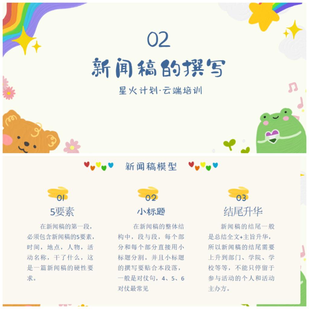本期星火培训的内容是新闻稿和软文的撰写,王瑜学姐通过这次培训,将她的自身技能无私传授与我们。此次培训后,我更加明白了新闻稿和软文的重要性,作为活动后期最重要的一个环节,我了解到了新闻稿和软文撰写的不同格式要求以及注意事项,同时也为我之后的学习和工作之路上增添一个新的“助推器”。