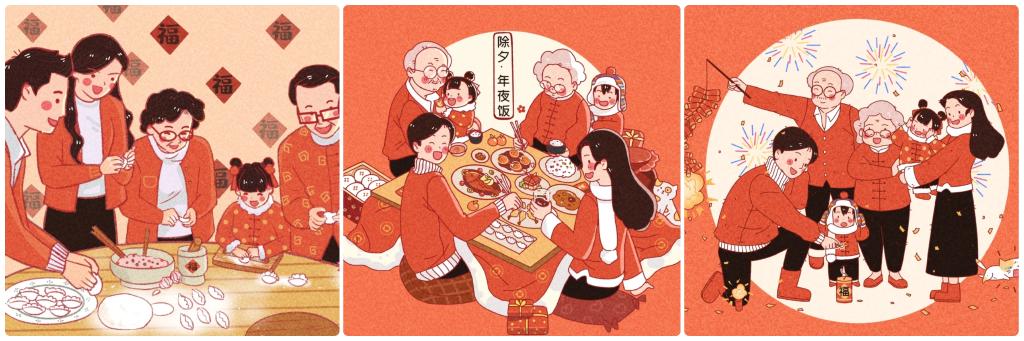 团年饭吃的是团圆幸福,品的是年味记忆,享的是万家安康。家人的团聚往往令一家之主在精神上得到安慰与满足,一家大小共叙天伦,老人家眼看儿孙满堂,而年轻一辈,也借此机会向父母的养育之恩表达感激之情。小时候,除夕是丰盛的团年饭、盼望的压岁钱;长大后,除夕是漫漫的回家路、满满的幸福感。一年一度的春运如同流动的风景线,载着游子的思乡之情驶向团圆。游子们回到家除了吃团年饭、放鞭炮,他们还与家人们一起录制新年短视频、制作除夕表情包、拍摄团圆写真……这些创意团聚为传统习俗增添了新活力和更多欢声笑语,也让我们懂得了团圆的意义,更珍惜与家人在一起的每分每秒。