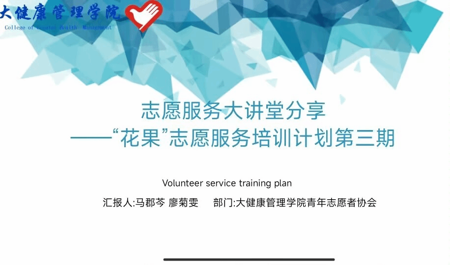 宣传志愿精神,弘扬志愿风气,播撒志愿种子。为进一步推动大健康管理学院基层志愿服务建设,促进志愿服务精神的传播,大健康管理学院青年志愿者协会于2023年1月31日开展了线上“花果”志愿服务培训计划第三期。本次活动由大健康管理学院青年志愿者协会行政部干事马郡芩以及实践部干事廖菊雯为大家讲解志愿服务的相关信息,希望大家能够更加了解志愿服务。