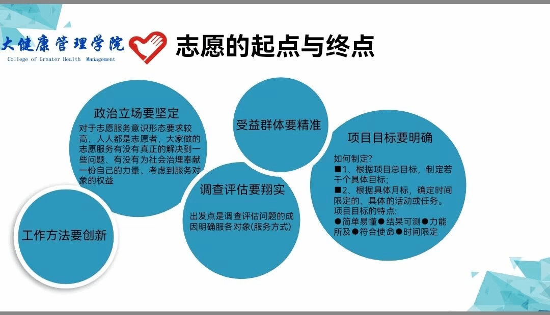 在本次培训中,令我受益匪浅。了解到了志愿服务项目是如何设计的,更加清楚地认识到了志愿服务的出发点,让我更加坚定地行走在志愿服务的道路上。培训中强调的问题也提醒着我们,我们在志愿服务工作中应明确项目方向,对志愿工作做出详细规划。青年志愿者是志愿文学创造的主体,我们大学生应该不负韶华,砥砺前行,在志愿服务上献出自己的一份力量