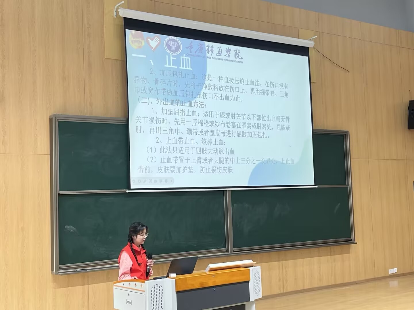 接着,马郡芩提到大多数人的伤口会伴随出血的情况,因此如何第一时间止血尤为重要,她讲解了多种当患者外出血后如何止血方法,包括多用于体表临时性止血的指压止血法、多用直接压迫止血的加压包扎止血法、加势屈指止血法、止血带止血法、绞棒止血法。其次,针对不同的出血情况,她为同学们讲解了伤口包扎的方法:绷带卷包扎法,包括适用于小伤口环形、适用于创面较大的伤口螺旋形、适用于关节损伤横“8”形等包扎方法;三角巾或者宽布带包扎法:随各受伤部位的不同而包扎方法各不相同。她尤其指出需要充分暴露伤口并加盖干净敷料,腹部脏器不要回纳,异物不要拔出,包扎的松紧要适当,不要打在伤口上。进一步促使同学们了解出现更严重的伤情如何处置。