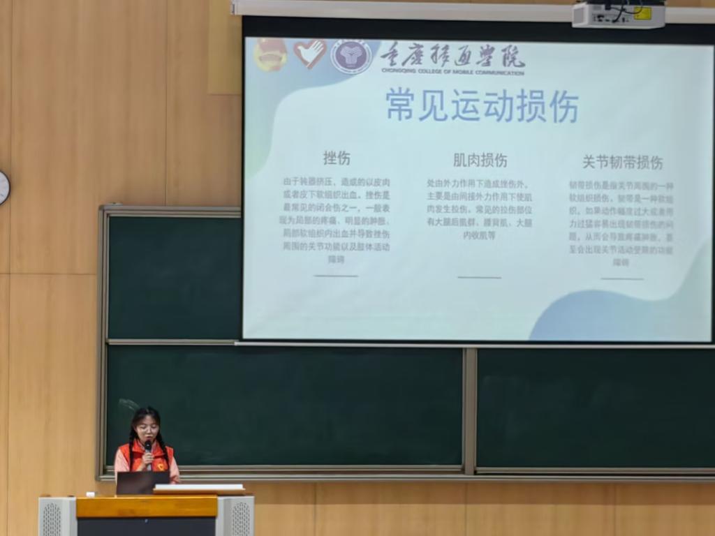 随后,她指出常见的运动损伤包括挫伤、肌肉损伤、关节韧带损伤。分别说明各自的成因,提出针对运动损伤成因采取的应对方法。当挫伤时,应在24小时内进行冷敷处理,防止关节肿胀范围过大,24小时后需进行热敷处理,具有不错的消肿、止痛效果,对于疼痛感强的患者,可以口服布洛芬等药物进行缓解;当肌肉损伤时,应立即冷敷,外压包扎并提高伤肢,一般建议24小时可外敷中药,也可进行理疗或按摩。如大量断裂时,经加压包扎等急救处理后,应立即将伤员送至医院治疗;当关节韧带损伤时,需要冰敷、制动休息,如果症状严重,及时送医,可以通过肌骨超声或者磁共振来检查确诊,要根据具体损伤的严重程度决定治疗方案。最后,本学院的体育老师以视频的方式为各位同学讲解了在运动过程中受伤的应对方法,用更科学的、更安全的方法去参与体育运动。使同学们明白只有运用合理的急救措施才能提高援助效率,避免耽误伤者救治。