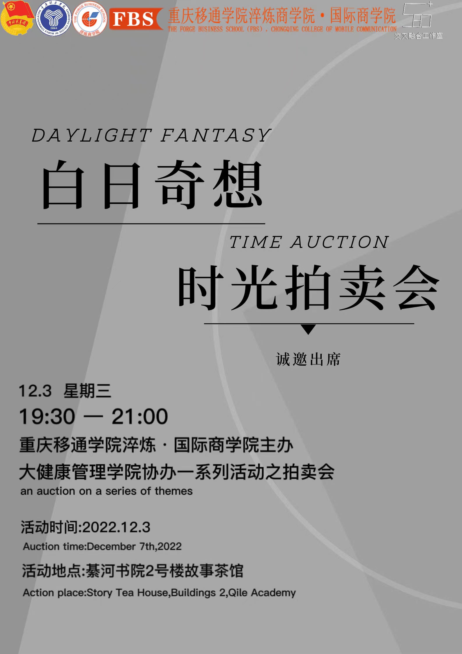 为了让同学们奇思妙想永不褪色,让我们来做个交易吧。时光为你而留,将你所拥有的技能,你的时光交给我们,最专业的“时光交易事务所”为您服务。社会竞争的日益激烈,社会对人才的需求日趋复合性,为有效缓解同学们对现阶段的不知所措,“商科+”交叉融合工作室从我校四位一体办学教育理念出发,具化大学生创新创业思维培养,落实商科教育和多学科交叉。淬炼·国际商学院联合大健康管理学院,大数据与计算机科学学院,电影评论中心,瀛洲科幻学院,数理部以及多个社团于2022年12月7号在綦河书院二号楼东篱故事茶馆共同举办“白日奇想-时光拍卖会”。让我们拭目以待吧!首先介绍本次拍卖会邀请到的创新创业板块的嘉宾有:胡纯菲,吴君华,李博文。让她们以时光与你交换“梦想”,只要你敢拍,我们就敢教,让我们共同拿出自己的一小时,一起探讨创新创业的奥妙,一起不再迷茫吧!