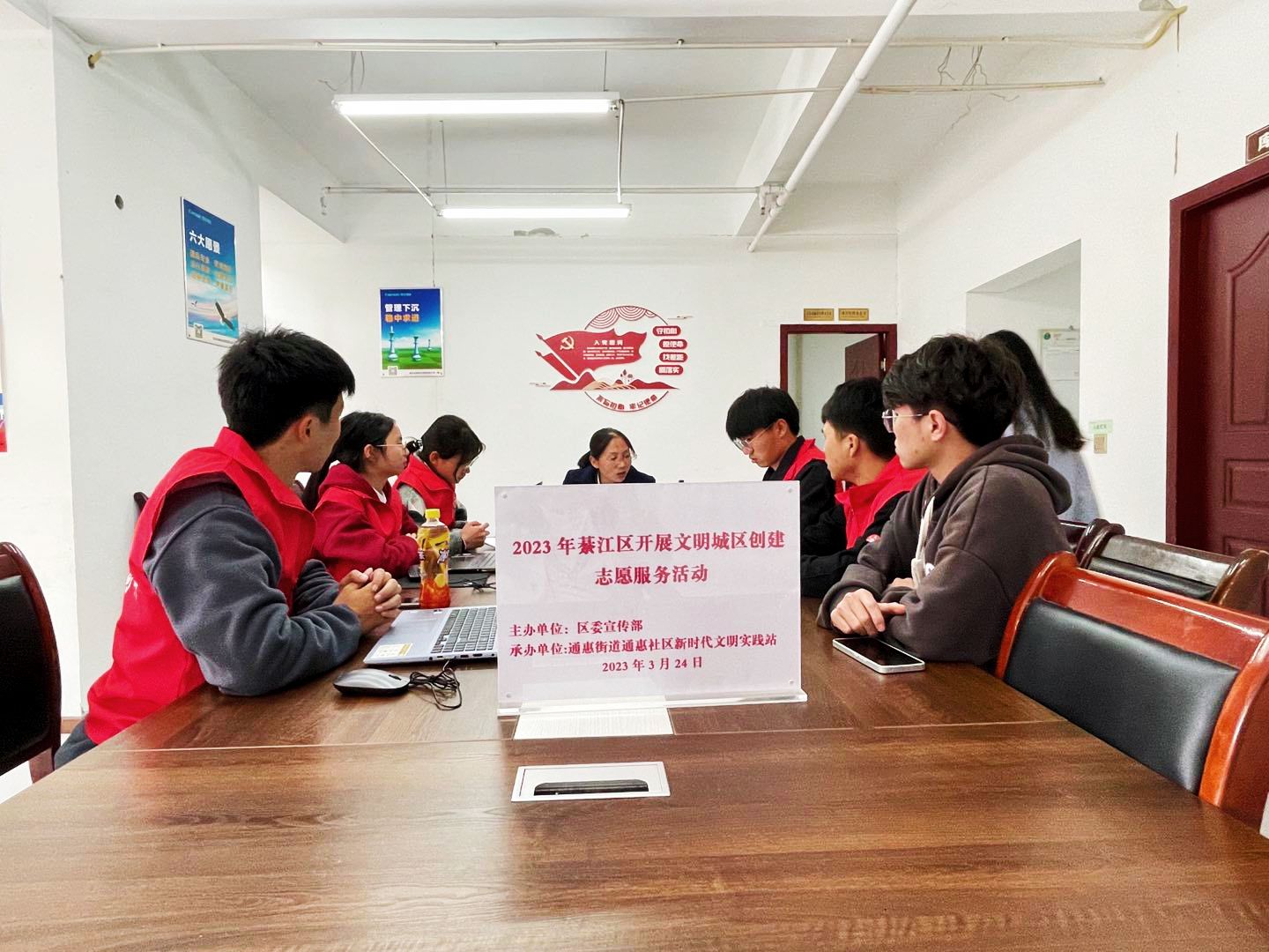 为了助力綦江区文明城区的创建,进一步弘扬新时代雷锋精神和“奉献、友爱、互助、进步”的志愿者精神,践行社会主义核心价值观,传递爱心,传播文明,减轻社区服务人员工作压力。大健康管理学院与通惠社区携手联动,2023年3月24日下午2点,大健康管理学院志愿者走进新都汇和东方新天地小区进行文明城区的资料录入整理工作。用实际行动将雷锋精神与志愿者精神相结合,让雷锋精神薪火相传,永垂不朽。在四个多小时的努力下,志愿者们共计录入3600余户居民信息,成果显著。