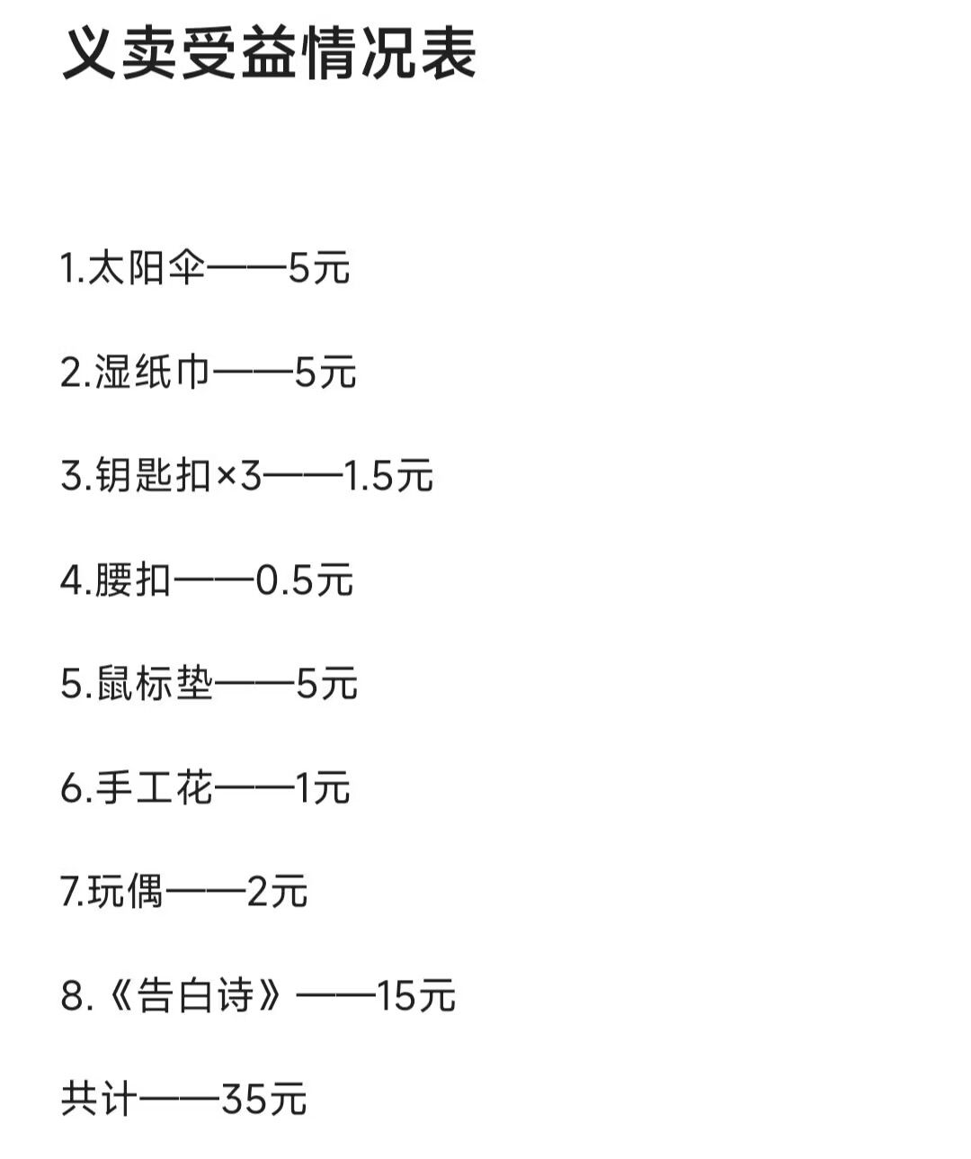 让爱保留原本的温度,切实把爱的温暖之光照亮社区特殊家庭。活动结束后,志愿者们将义卖收入进行汇总清理,并及时进行公示,将卖出所得百分之百用作看望社区特殊家庭时的看望物品的费用,剩余没有卖出的物品将作为捐赠物品捐赠给特殊家庭。义款合理使用,实实在在在的做到物有所需,物有所值。