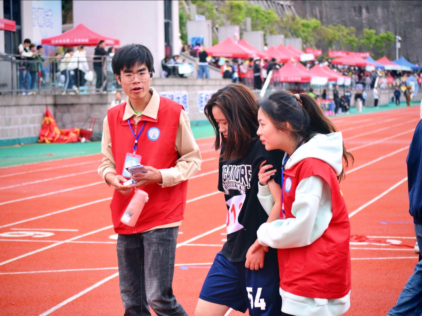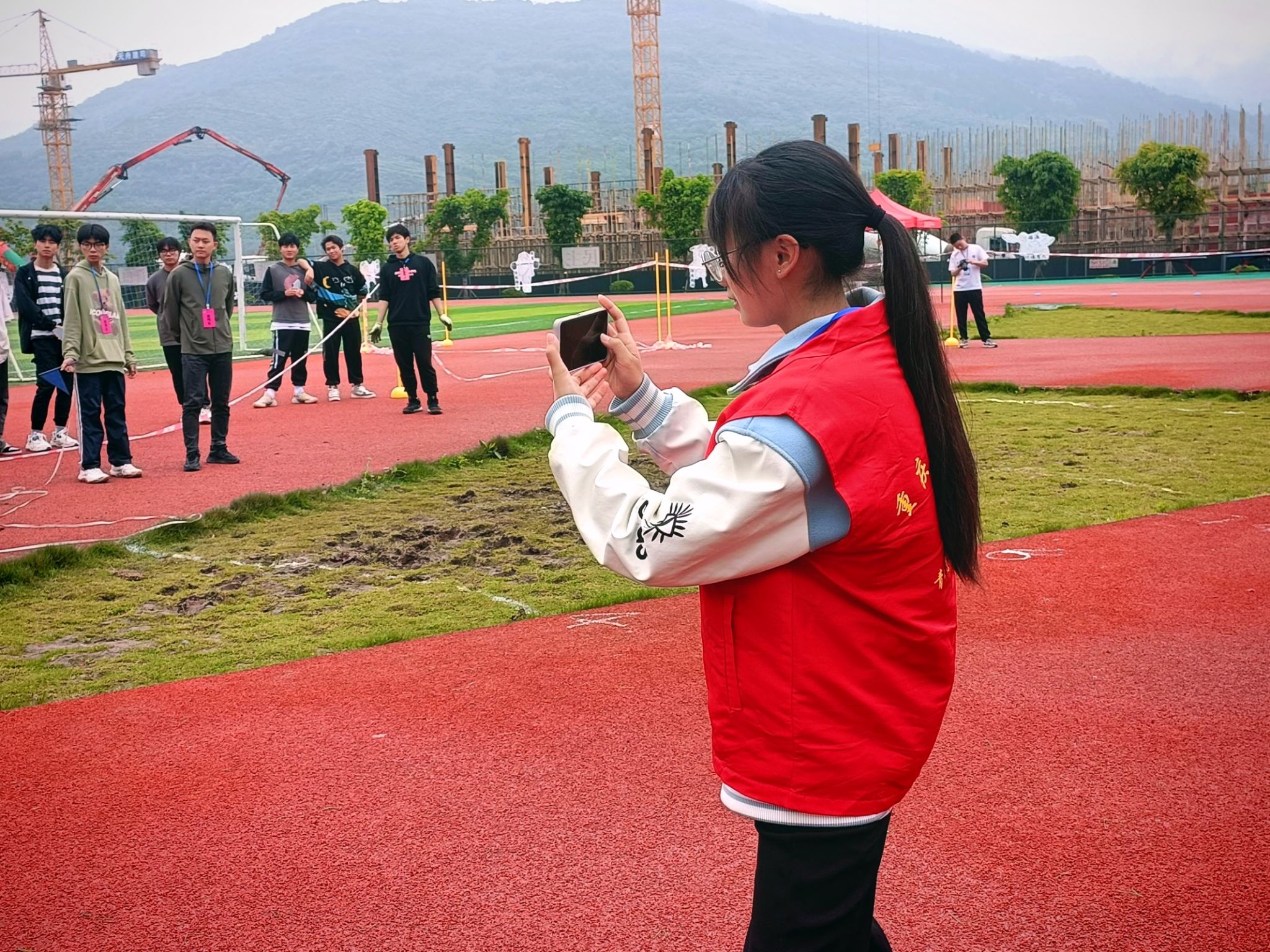 在运动会期间,除了在前“作战”的运动员,还有负者后勤的同学们,他们早早的到达操场,有的安排场地,有的检查设备功能,有的检查场地安全问题,有的摆放比赛器材。原本寂静的操场一下子变得忙碌起来。当然现场秩序的维护也离不开每一位志愿者的努力,他们及时向比赛选手传达比赛信息,协助运动员检录、比赛,捕捉运动员们的精彩瞬间,及时为中暑、疲惫的运动员送上藿香正气液、葡萄糖水···