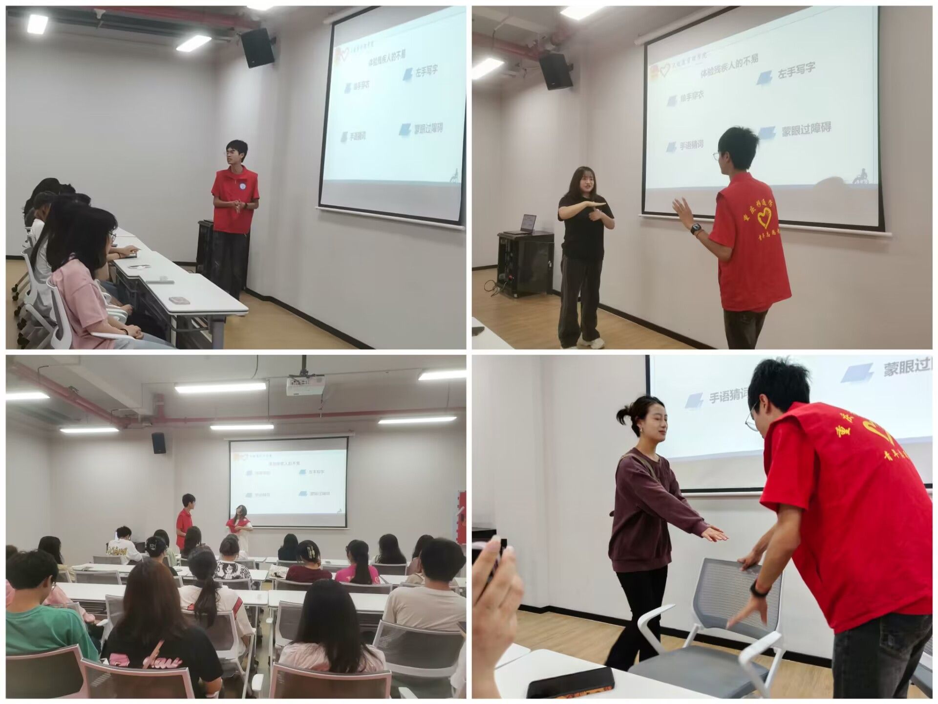 每年的5月21日,是属于残疾人朋友们重要日子——全国助残日。在这个特殊的日子里,为让同学们理解关心,尊重帮助残疾人,了解有关残疾的相关知识。大健康管理学院于2023年5月19日在玉棠书院扎堆朋辈空间召开关爱残疾人角色互换活动。由大健康管理学院青年志愿者协会行政部干事峗庆帝主讲,共50名同学参与其中。