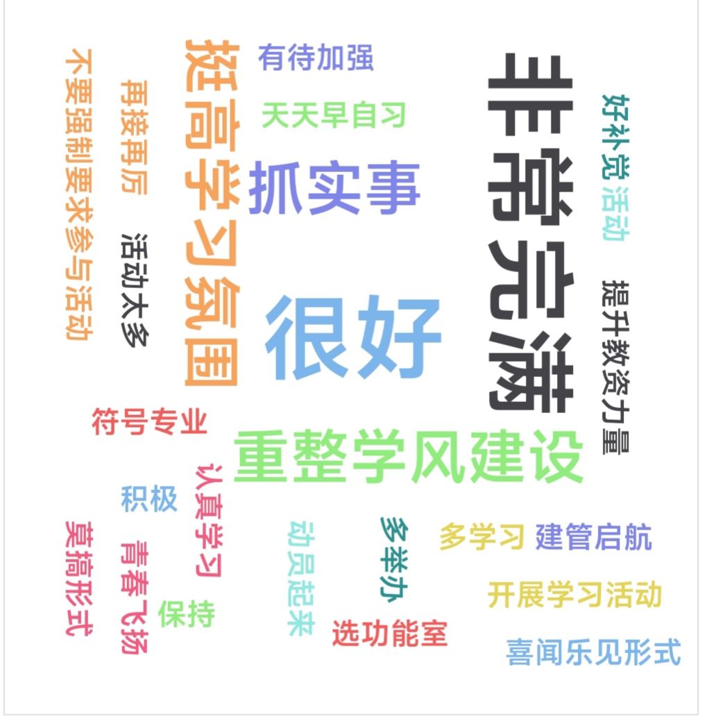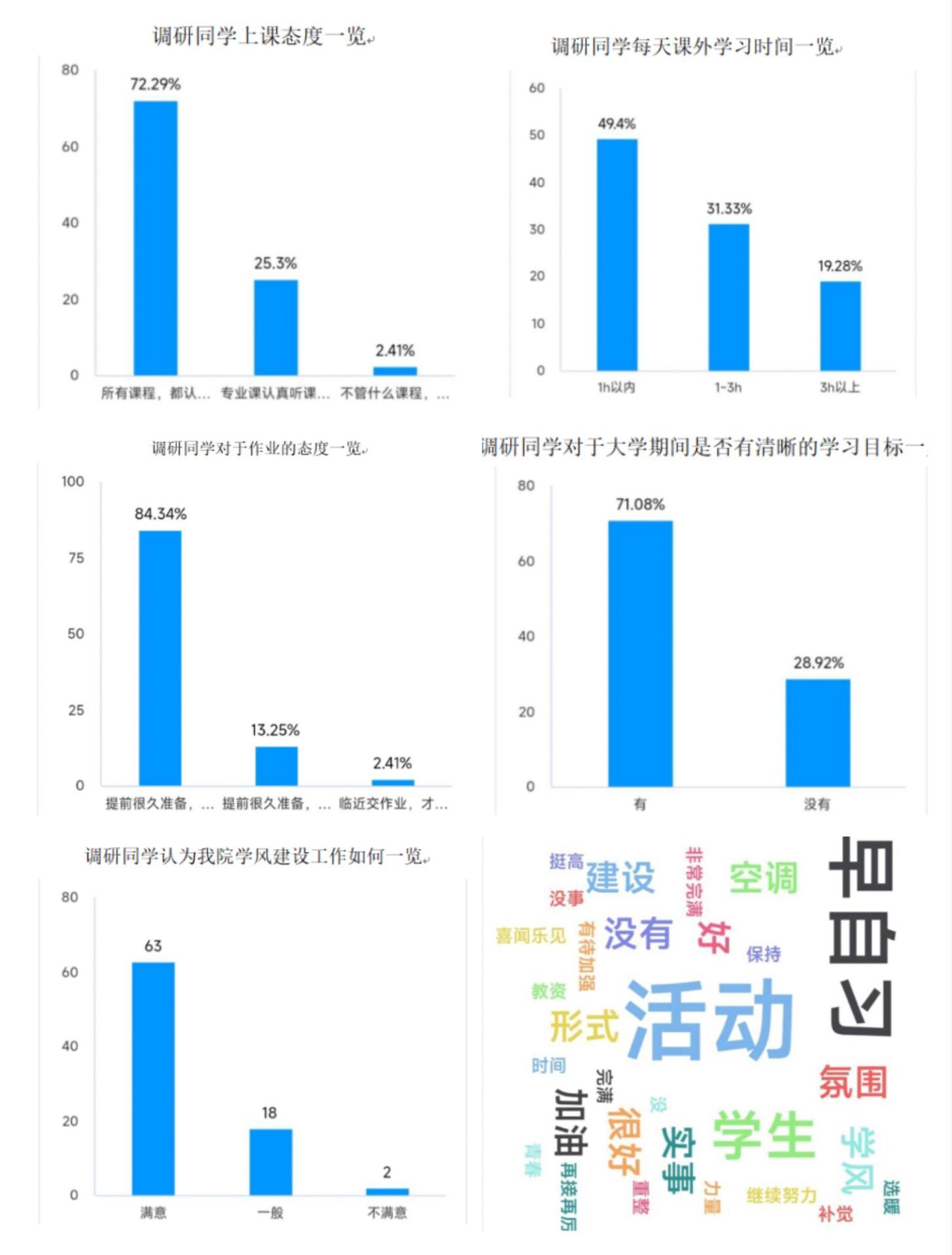 据调研结果显示,有75.9%的同学满意我院学风建设工作;有21.69%的同学觉得我院学风建设工作一般。因此同学们最多希望我院的学风建设可以增加一些活动;其次是取消早自习或者增加空调等。对于上课听讲的认真程度,大部分同学都是认真听课,但仍有小部分同学对课程并不在意说明这一方面有待加强。对于老师布置的作业来说,同学对于作业会提前很久准备,认真,独立,快速的完成,但仍有一小部分的同学对于作业并不是非常在意,说明大部分同学对于对待作业的态度是非常认真的许多同学对于教师的学风方面是持有较高的评价的,说明老师的教学风格深受同学们的喜爱。针对于学风,更多的同学希望能增加一些有关这一方面的活动,能够让我院学风发展得越来越好。