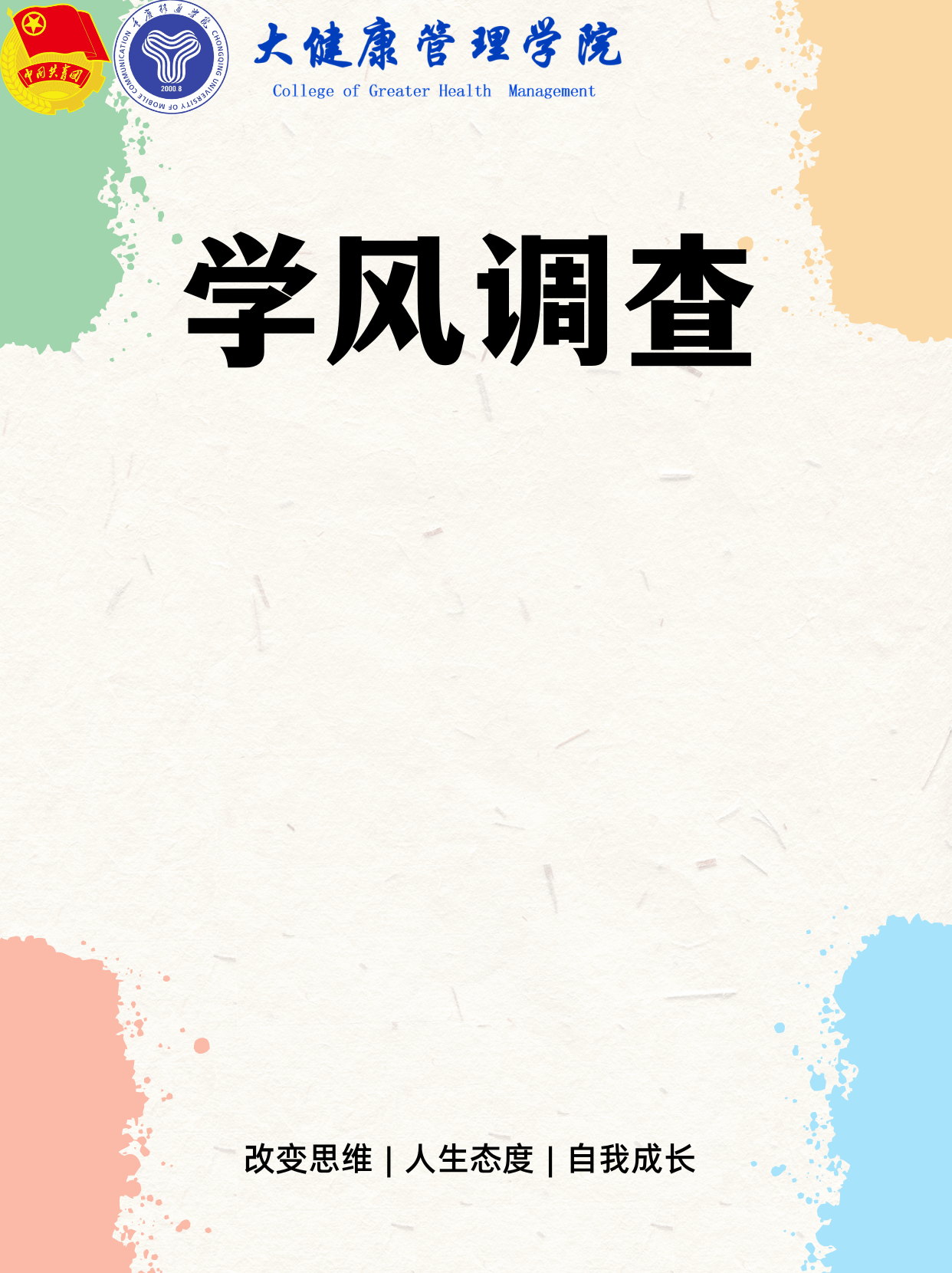 为促进我院学风建设的深入开展,鼓励广大学生勤奋学习、积极向上,保持优良的学风,促进学生思想道德素养和科学文化素养的协调发展,我院内涵化发展提供更多的数据参考,为学院后期建设提供参考性的意见。五月伊始,大健康管理学院以学风为背景,于5月11日—5月22日展开了力笃励尊·学志学师——大健康管理学院权益部5月“学风建设一起行”主题调研活动。学风是一种学习氛围,也是一种群体行为,更是一所大学的灵魂和气质。学风即学校风气,从广义上讲就是学校师生员工在治学精神、治学态度和治学方法等方面的风格,也是学校全体师生知、情、意、行在学习问题上的综合表现。