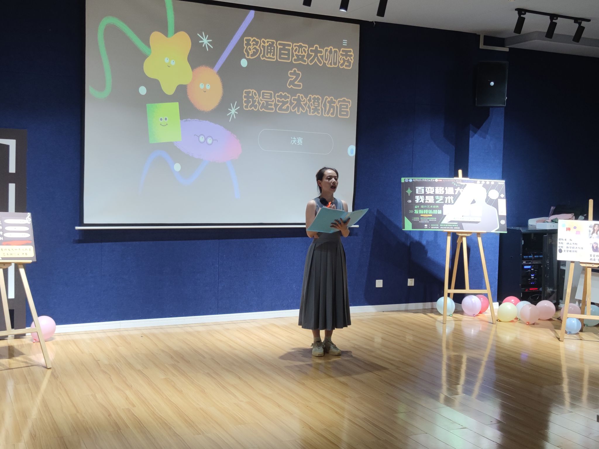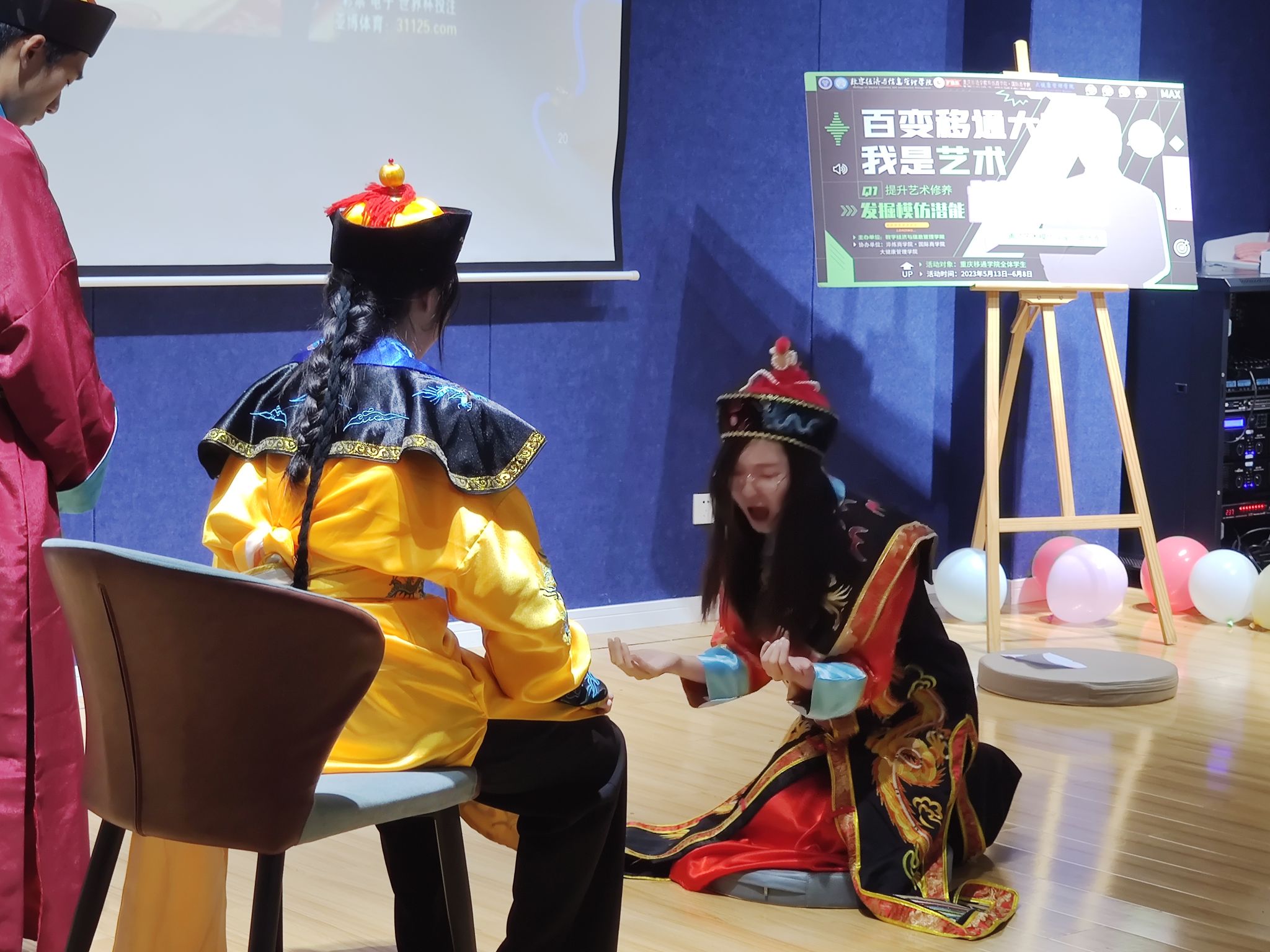 每一种文化的精彩呈现,都将成为一座城市美好的印记。大咖秀作为一种视听舞台艺术,是城市生活的艺术表达,是精致生活的舞台演绎,亦是社会焦点的真实呈现,每一部剧都是一部精彩的人生之旅。为了丰富校园文化生活,努力营造至善至美的校园文化氛围,激发同学们热爱艺术、展露才华的热情,发挥同学们的特长。淬炼国际商学院、大健康管理学院以及数字经济与信息管理学院经过特此举办“我是艺术模仿官”活动!通过复赛的激烈角逐,6月2日下午两点半,“我是艺术模仿官”决赛在綦河书院二号楼苍山阶梯教室拉开了帷幕。