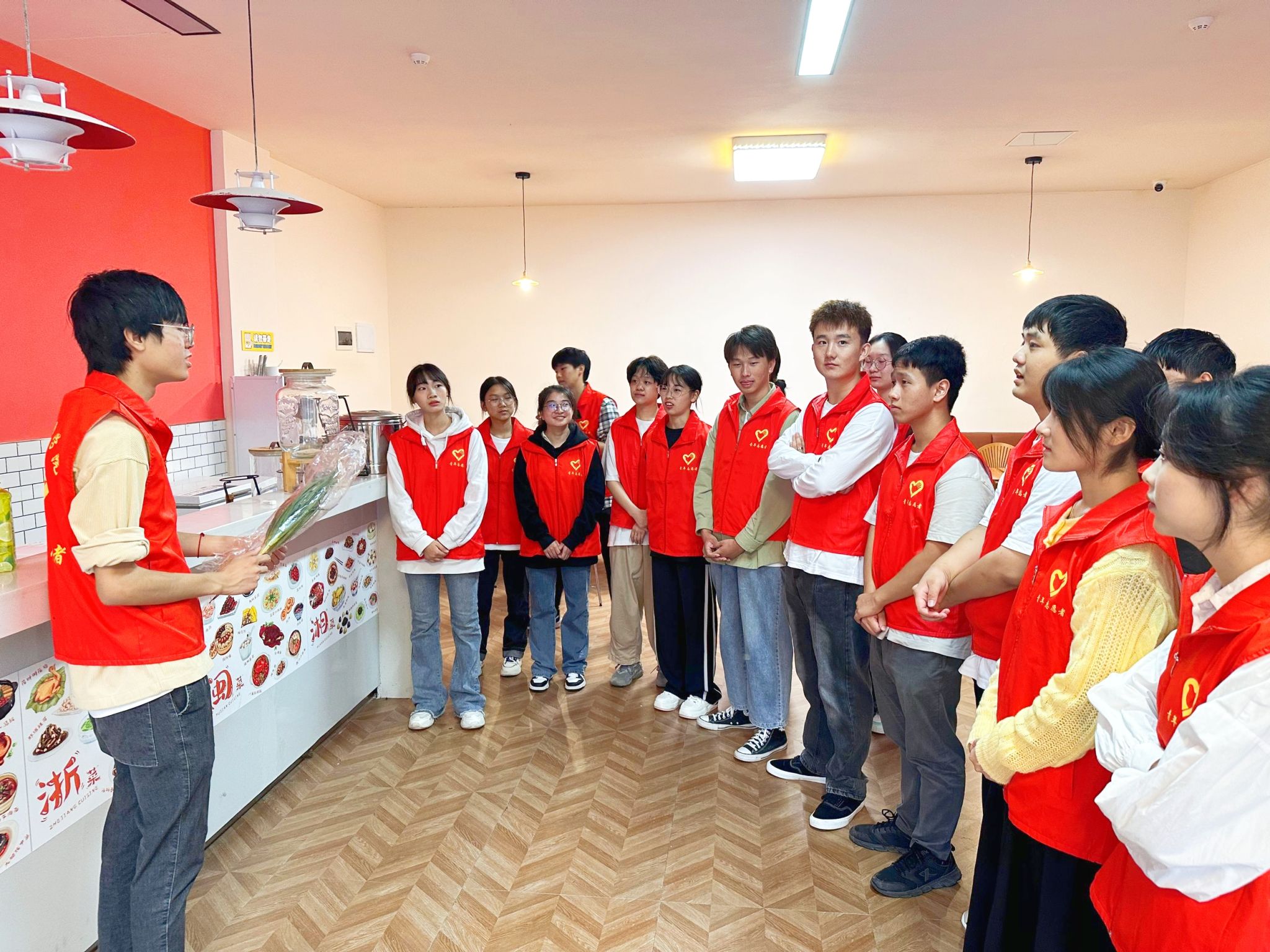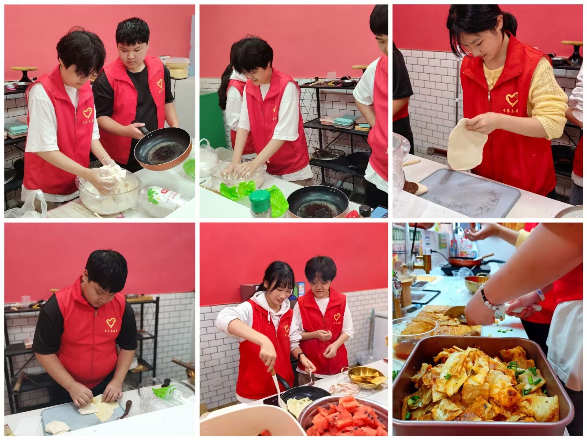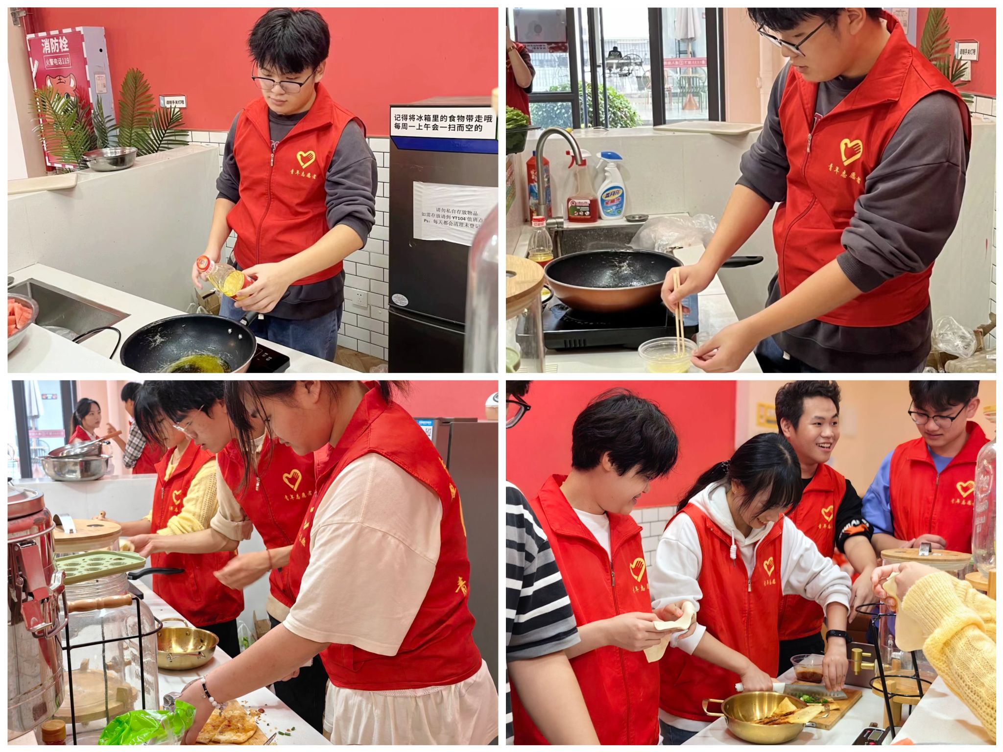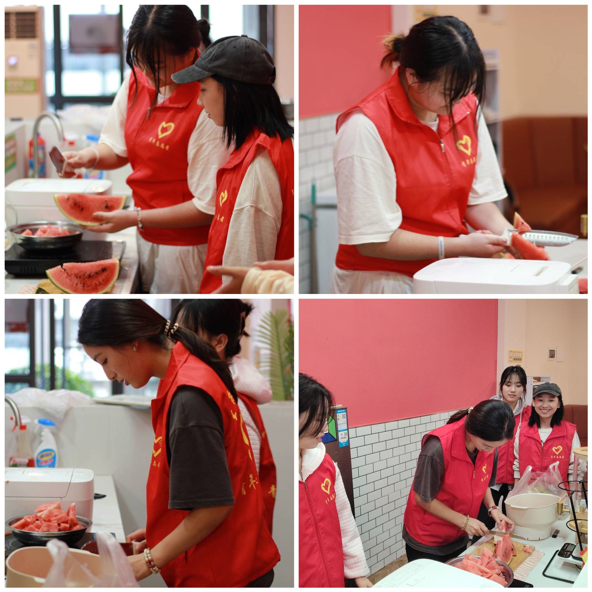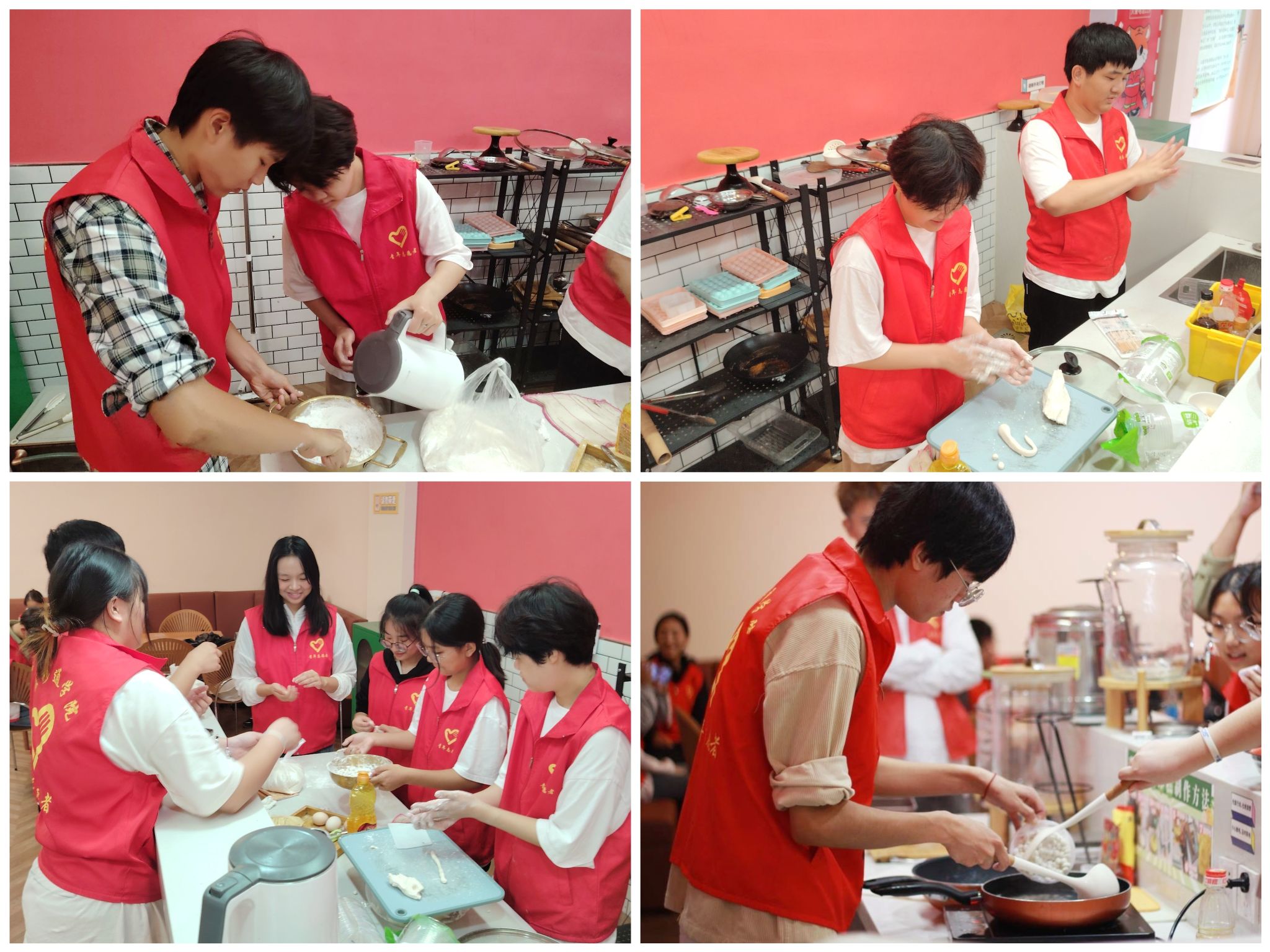 志愿者们首先对各类食材进行了加工制作,通过“熬制红糖水—熬制冰粉—切西瓜—制作冰汤圆”制作出了一道令人食欲大开的冰粉;通过“制作酱料—和面—发酵—烙面皮—油锅炸”制作出了飘香肆意的酱香饼。在本次活动中,同学们在各自的职位之中通力合作,共同参与,志愿者们一步一步的完成一道道工序,在这个过程之中,同学们感受到了合作中的友谊,和食物来之不易的艰辛让同学们受益匪浅。