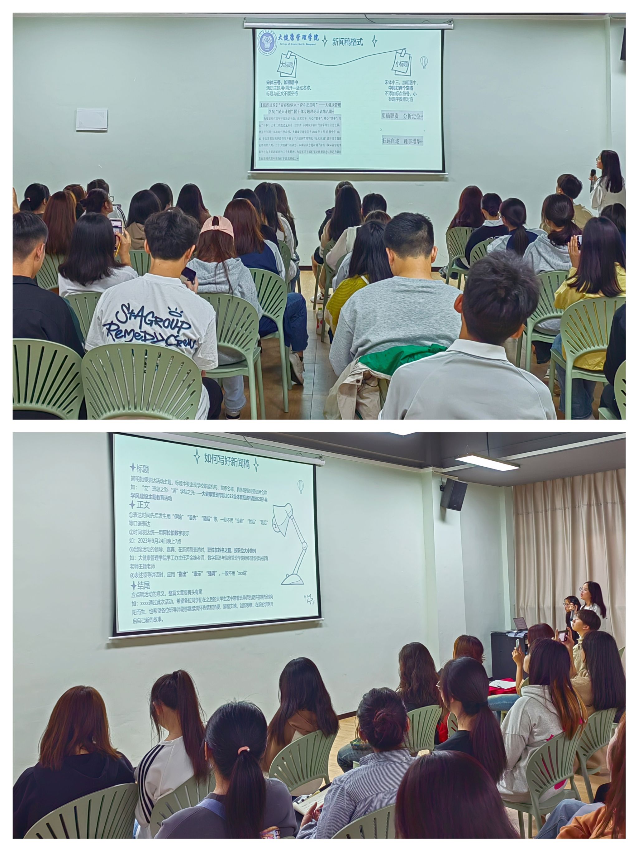 为培养新晋干事的新闻稿撰写能力,提高新晋干事的办事效率,推动新晋干事更好的投入组织工作中,同时促进大健康管理学院学生组织的后续发展,大健康管理学院于2023年10月11日下午4点在横山书院知物·多功能活动室开展了大健康管理学院团干部培训第一期:“新闻稿的撰写”。本次培训会邀请到了大健康管理学院组织部部长赵梅学姐为大家讲解新闻稿的独特性、如何写好新闻稿,以及新闻稿撰写的要求与格式。为新晋干事对新闻稿的熟悉程度和技巧掌握打下坚实的理论基础。